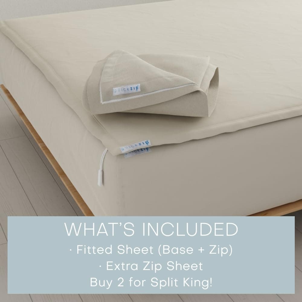 1. Sábanas ajustables reinventadas: QuickZip es una sábana ajustable patentada de 2 partes que es conveniente, cómoda y sin problemas en todos los sentidos imaginables; Colocar o cambiar las sábanas ajustables en el colchón nunca será un problema nuevamente. 2. No se desprenderá: La base de la sábana ajustable está abierta en la parte inferior y abraza firmemente los lados del colchón, con las esquinas SuperGrip patentadas que la mantienen firmemente en su lugar; Bolsillos profundos (15”), elástico continuo duradero, se ajusta a UN colchón Twin XL de hasta 80” x 39”. Para Split King, agregue 2 al carrito. 3. Sábanas con cremallera de acción rápida: Las sábanas con cremallera se pueden quitar y poner fácilmente en la base ajustable con la ayuda de una resistente cremallera YKK que permanece oculta a la vista; Este juego de sábanas Twin XL incluye dos sábanas con cremallera de satén premium de 400 hilos de algodón 100% de alta calidad que están certificadas por OEKO-Tex. NO INCLUYE sábana plana ni fundas de almohada. 4. Fácil de limpiar, cambiar y doblar: A diferencia de los juegos de sábanas ajustables de antaño que son increíblemente engorrosos de cambiar y lavar, la Sábana con Cremallera de QuickZip se quita con un simple movimiento de la cremallera; Extremadamente fácil de mantener, cambiar, lavar, doblar y almacenar. 5. Hecho pensando en tu comodidad: Las Sábanas Ajustables QuickZip son particularmente útiles para personas con colchones de difícil acceso en camas de esquina, literas, camas nido, camas altas, camas ajustables; Haz clic en ‘Agregar al Carrito’ para pedir hoy