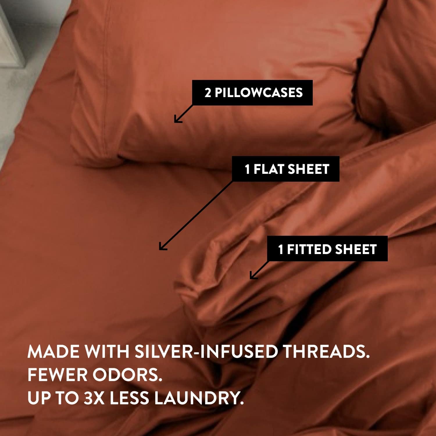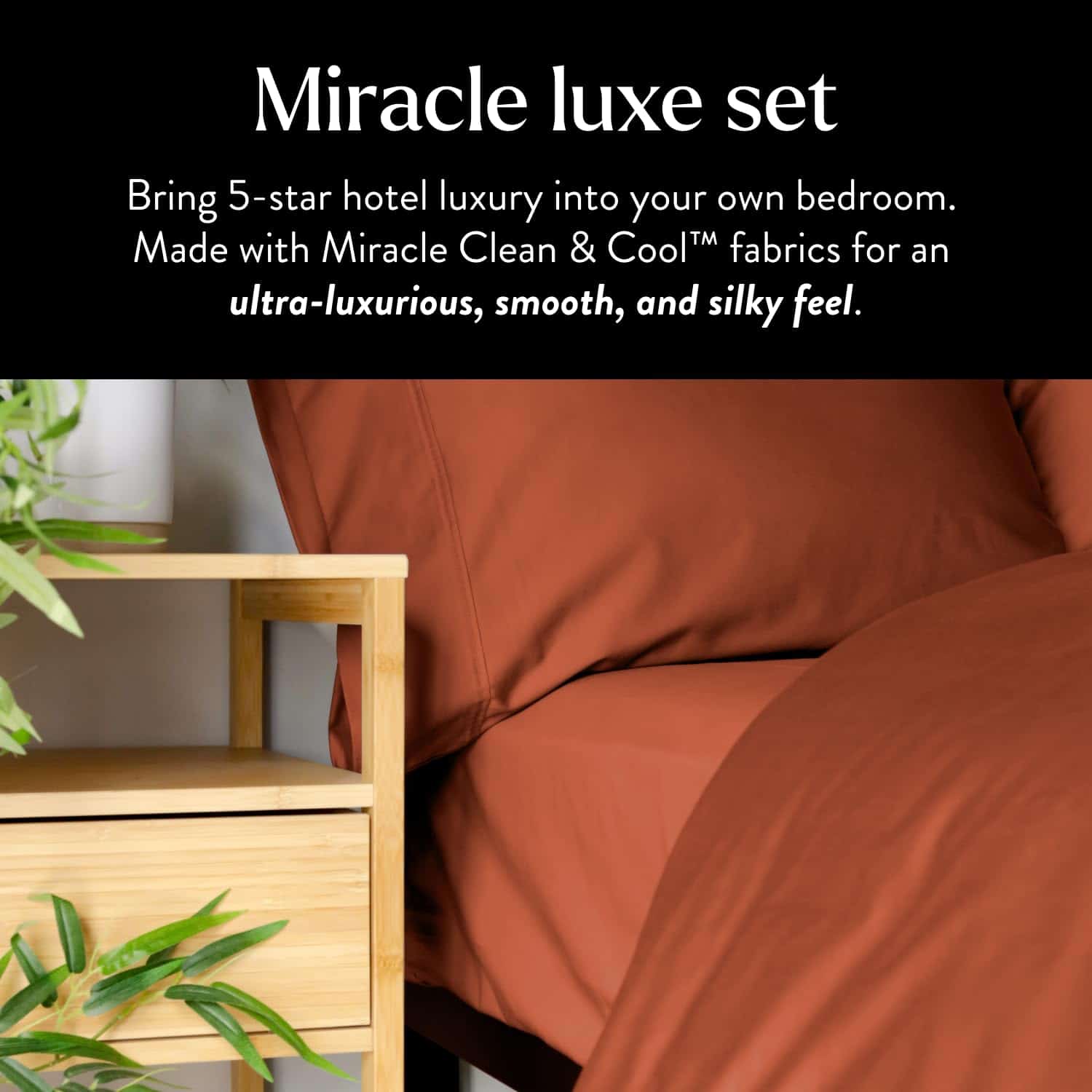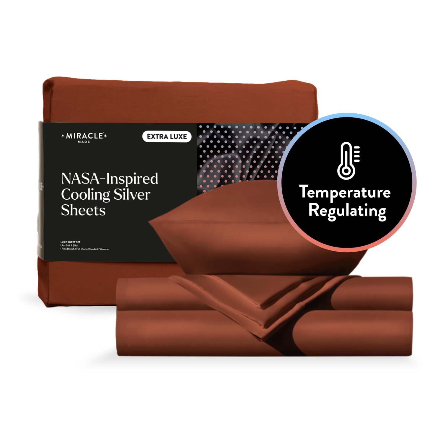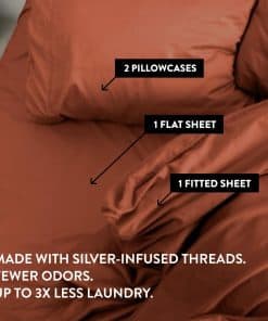 Conoce las Nuevas y Mejoradas Sábanas Ajustadas Miracle Made Extra Luxe Cool IT True Grip, una perfecta combinación de confort e innovación. Estas sábanas queen ofrecen una experiencia lujosa de 300 hilos para tu cama queen. Con una tonalidad terracota que añade calidez a cualquier dormitorio, estas sábanas de enfriamiento están diseñadas para transformar tu sueño. Nuestras sábanas tamaño queen reguladoras de temperatura son más que simples ropa de cama, son una solución para noches inquietas. La Tecnología Cool IT garantiza frescura duradera, respondiendo dinámicamente a la temperatura de tu cuerpo y el sudor, convirtiendo las sábanas ajustadas queen en las sábanas de enfriamiento ideales para quienes duermen calientes. Di adiós a las noches sudorosas y hola a un sueño refrescante con las sábanas de cama autoenfriantes. Estas sábanas ajustadas queen ofrecen un ajuste ceñido con la patentada Tecnología True Grip. Con esquinas elasticizadas y un elástico de un pulgada en la parte inferior, se mantienen en su lugar en camas ajustables, convirtiéndolas en las sábanas con infusión de plata tamaño queen que estabas buscando. No más deslizamientos ni ajustes constantes. Nuestras sábanas true grip queen son seguras para la piel sensible, proporcionando una superficie limpia y cómoda que podría realzar el brillo de tu piel. Fáciles de cuidar, simplemente lava a máquina y seca en secadora, reduciendo la frecuencia de lavado con su proceso de infusión de plata. El set de sábanas queen fresh incluye una sábana ajustada queen, una sábana plana y dos fundas de almohada, asegurando que tu cama esté estilizada a la perfección. Duerme bien, vive bien y sé feliz con Miracle Made, donde las sábanas de mantenerse frescas se encuentran con la elegancia sin esfuerzo