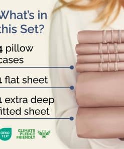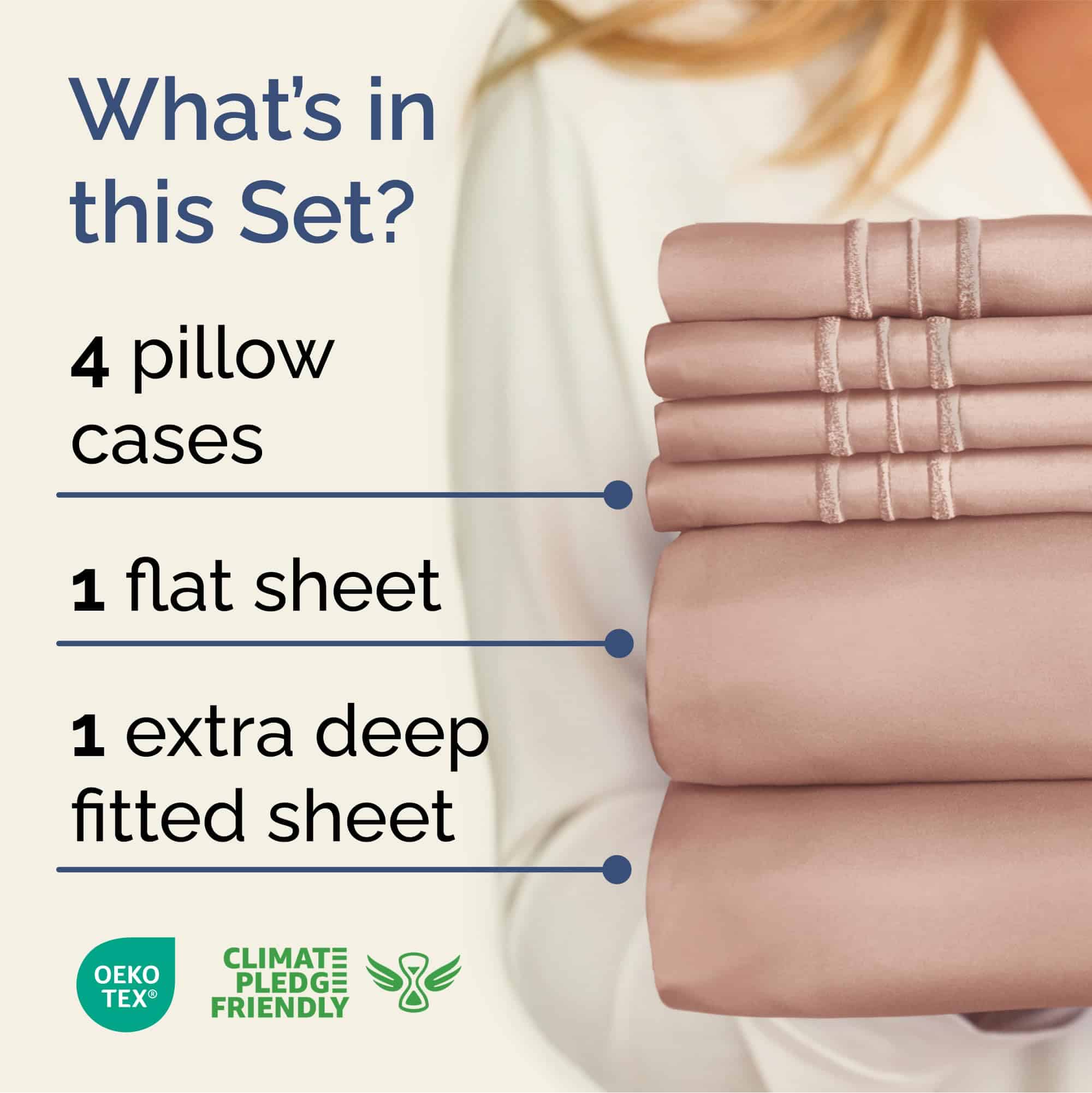 Cubierta plana de 117 pulgadas de ancho y 102 pulgadas de largo. Sábana ajustable de 72 pulgadas de ancho y 84 pulgadas de largo con 21 pulgadas de bolsillos (tiene elástico para que pueda estirarse). Los cuatro fundas de almohada son de tamaño extragrande, 20 x 40 pulgadas.