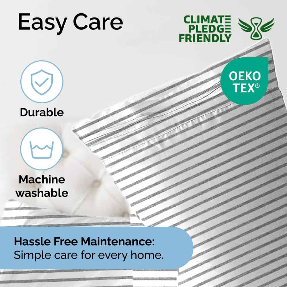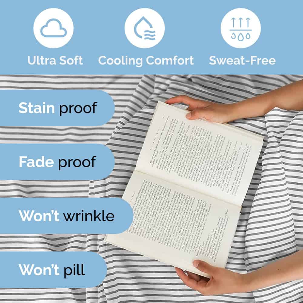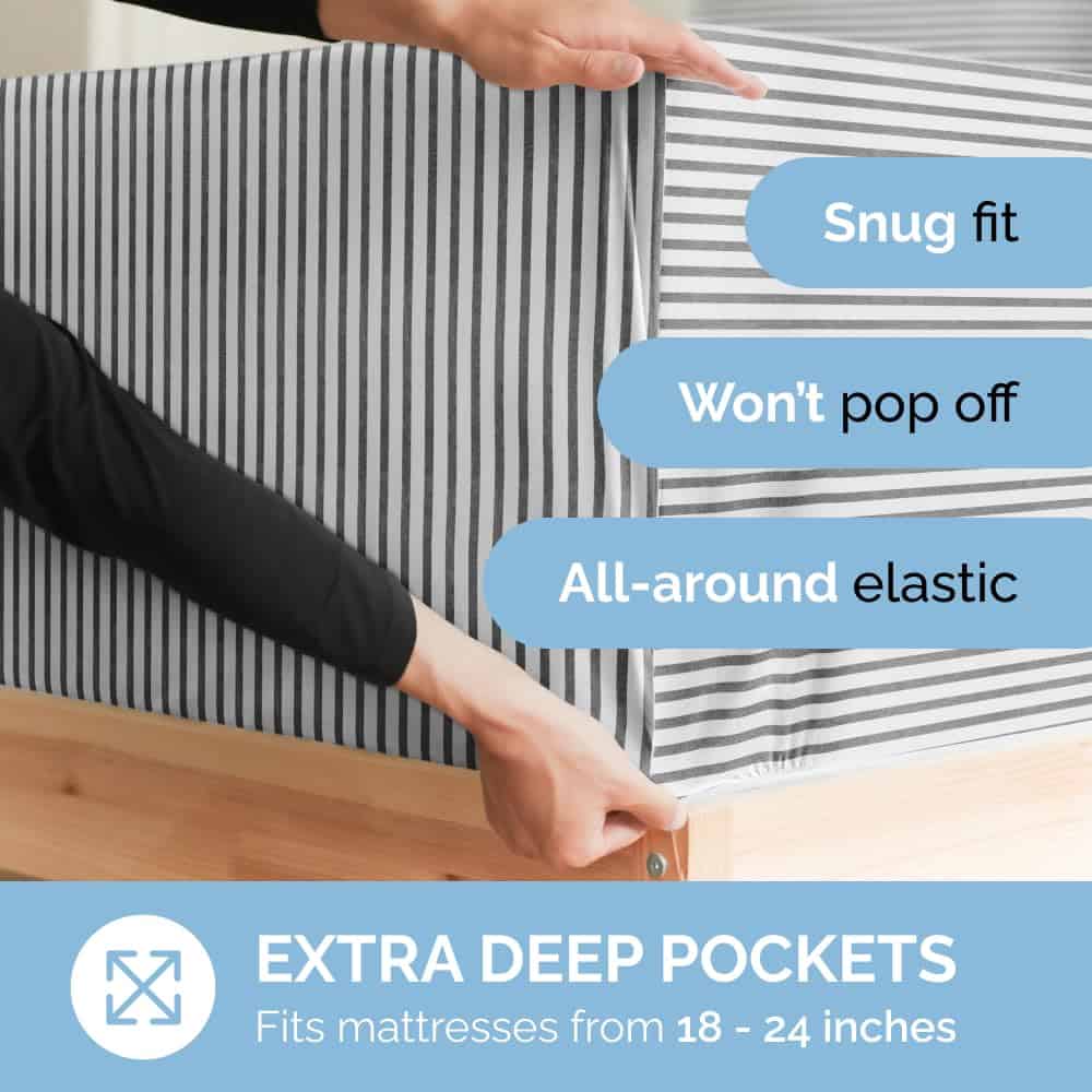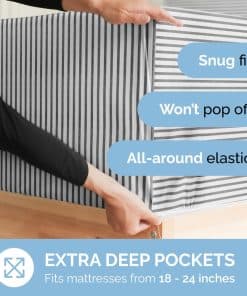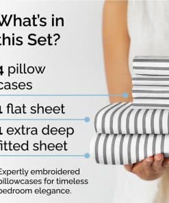 Este juego de sábanas Cal King Extra Profundas está diseñado para satisfacer las necesidades de quienes tienen colchones extremadamente profundos con la garantía de un ajuste perfecto. Con un total de 6 piezas, incluidas 4 fundas de almohada decoradas con un diseño bordado, este juego de sábanas es ideal para colchones con una colchoneta de 3 o 4 pulgadas en la parte superior, así como colchones de espuma con memoria, almohadillas de colchón grandes y más. Fabricadas con microfibra suave de alta calidad, estas sábanas son aún más suaves que las de algodón y tienen un tacto ligero que garantiza una comodidad excepcional. La sábana encimera mide 117 pulgadas de ancho y 102 pulgadas de largo, mientras que la sábana ajustable tiene 72 pulgadas de ancho y 84 pulgadas de largo con bolsillos de 21 pulgadas que se pueden estirar para adaptarse perfectamente al colchón. Las cuatro fundas de almohada son extragrandes de 20 x 40 pulgadas, lo que garantiza una cobertura total y una apariencia elegante en la cama. Brinde a su dormitorio un toque de lujo y sofisticación con este juego de sábanas Cal King Extra Profundas en rayas grises.