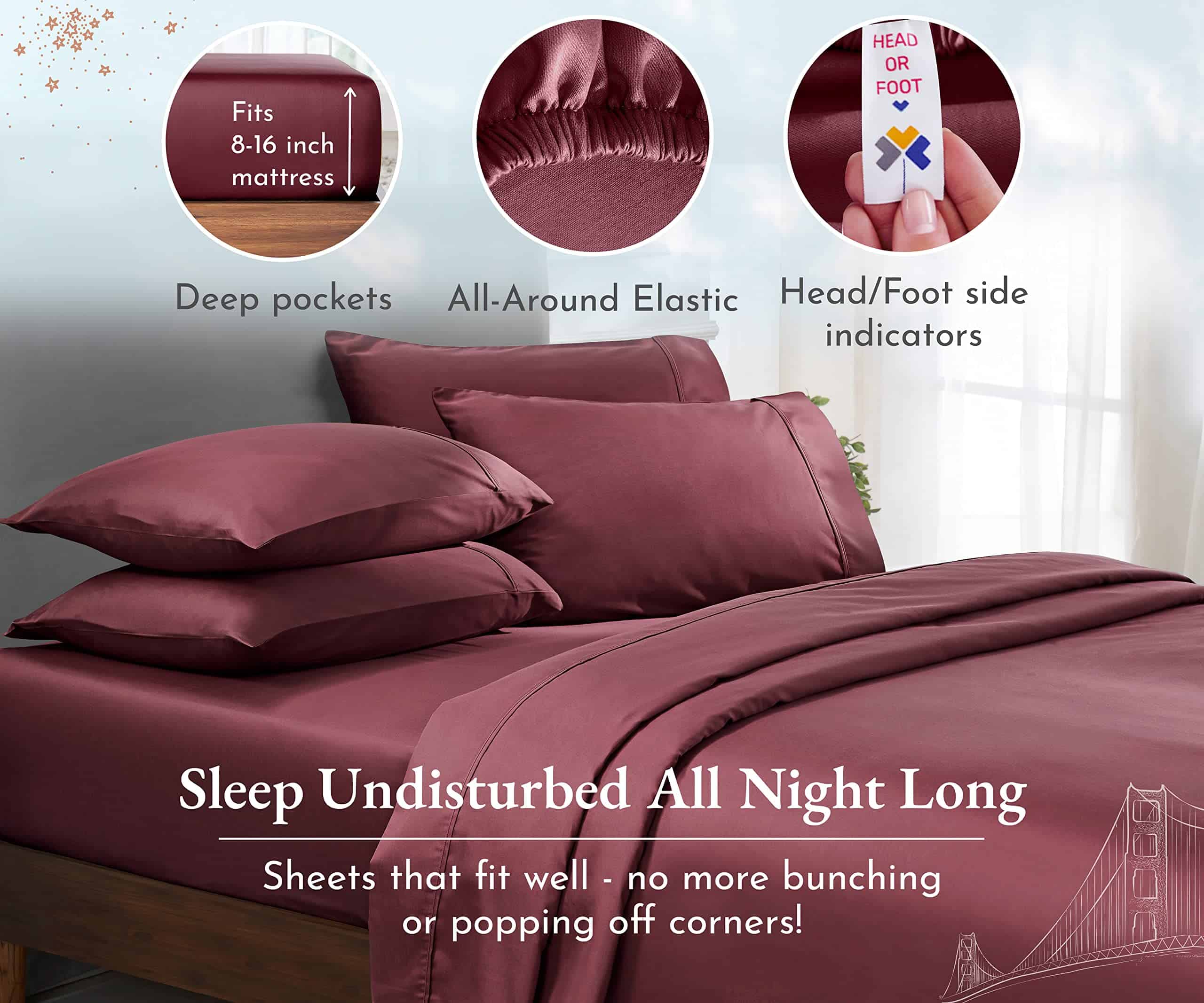 Descanse cómodamente con este juego de sábanas California Design Den. Este juego incluye una sábana ajustable, una sábana plana y cuatro fundas de almohada, todo en un hermoso color rojo borgoña. Con 400 hilos de algodón 100% y un tejido de satén que te mantiene fresco durante la noche. Las sábanas tienen bolsillos profundos para un ajuste perfecto en su colchón. Disfrute del lujo y la comodidad con este juego de sábanas de alta calidad.