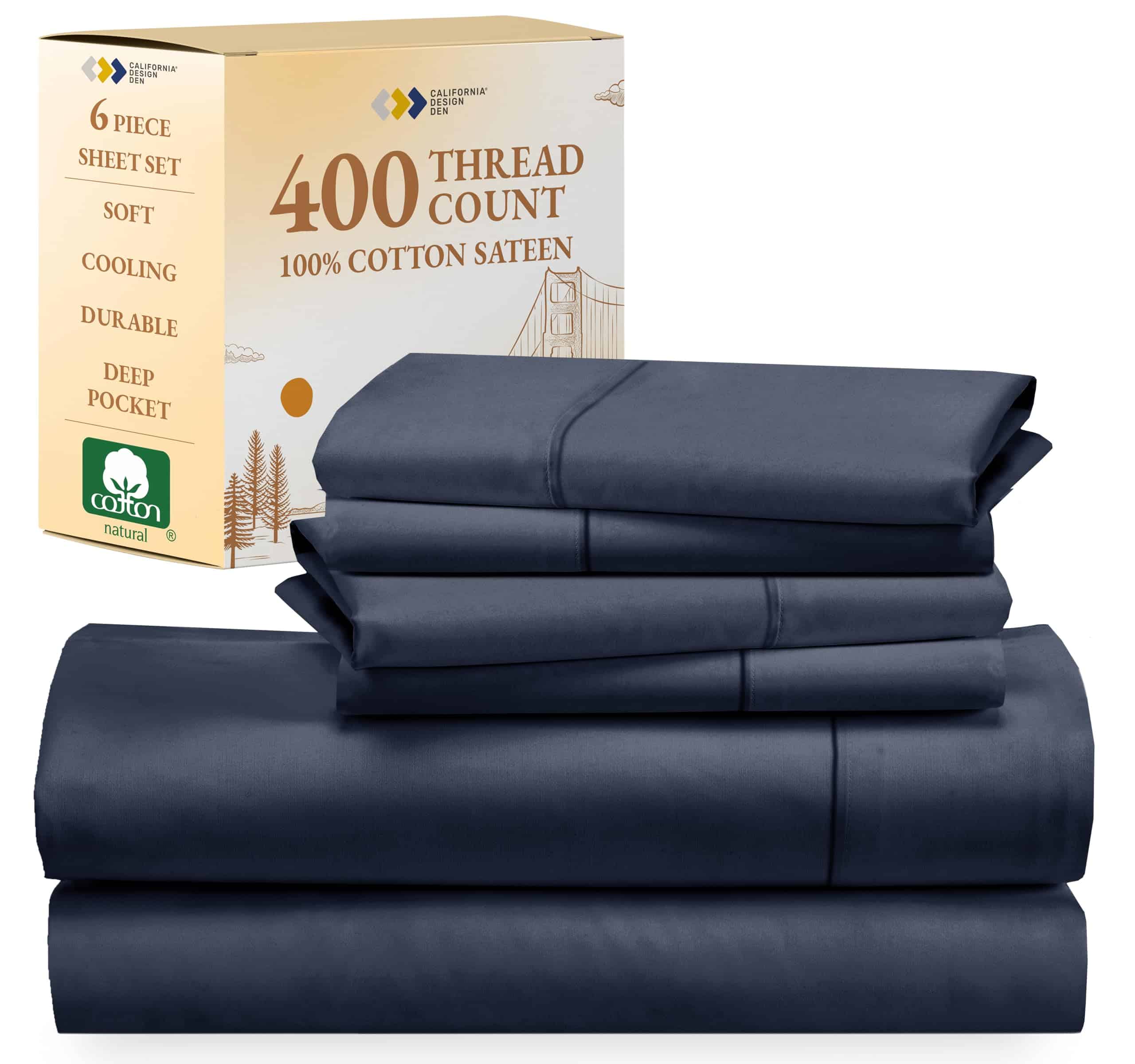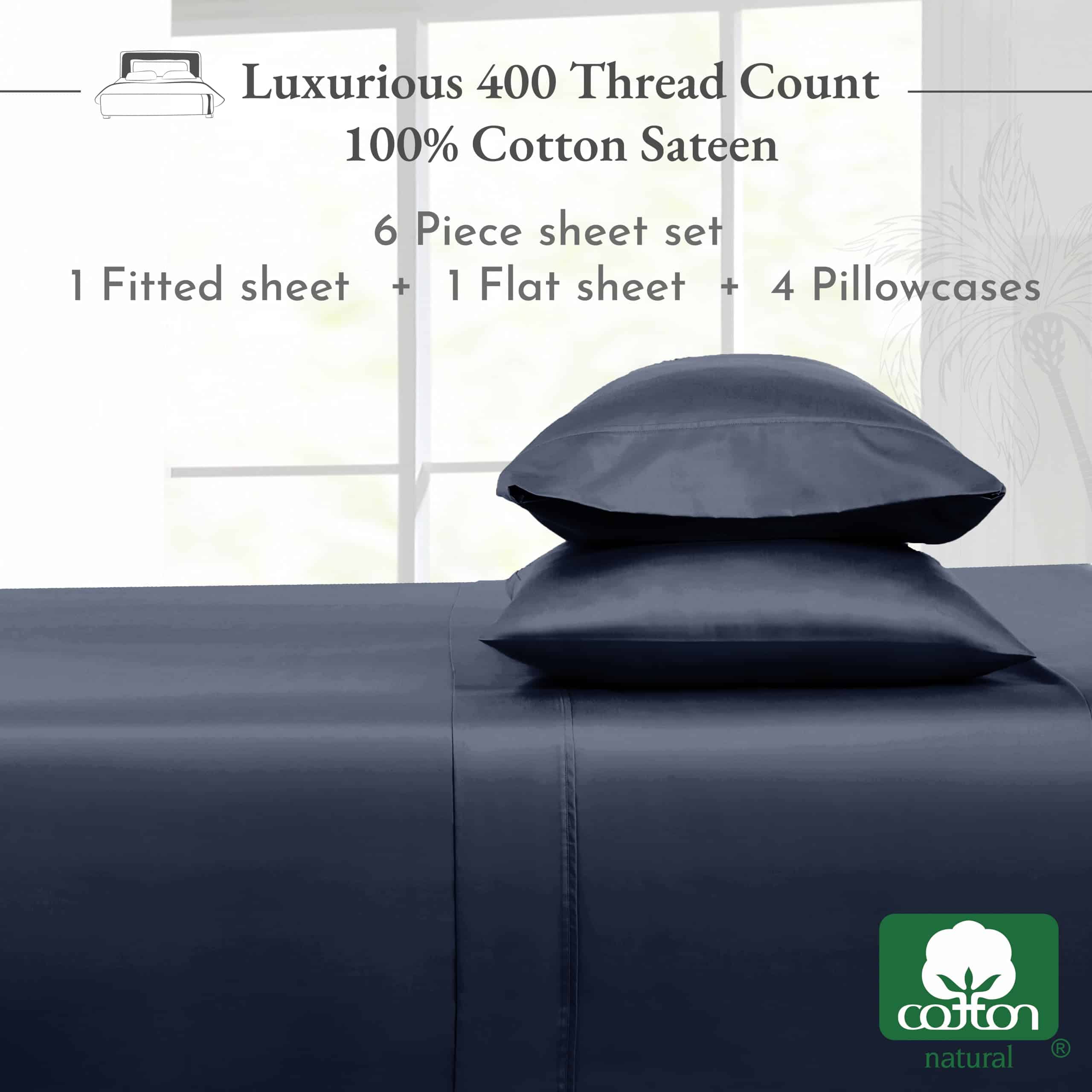 DESCRIPCIÓN: Descansa en el algodón 100% puro, de fibra larga, más suave, fresco y transpirable. Nuestras sábanas para cama tamaño king de 400 hilos y 100% algodón son cuidadosamente fabricadas a mano y cosidas perfectamente. AJUSTE DE CALIDAD DE HOTEL – Nuestras sábanas king de bolsillo profundo prometen un ajuste ceñido. El tejido de satén de hotel y las cómodas sábanas hacen que este juego de cama sea el más cómodo. Sin sustancias nocivas y fácil de mantener: es fácil cuidar nuestras sábanas de 100% algodón. Mételas en la lavadora para un lavado rápido. Estas juegos de sábanas king se vuelven más suaves con cada enjuague y no se encogen, apelotonan ni decoloran. También están probados e certificados independientemente por OEKO-TEX para estar libres de sustancias químicas nocivas. NUESTRO COMPROMISO: En 2022 y 2023, donamos más de 22,000 piezas de ropa de cama a organizaciones benéficas locales en EE. UU. No usamos plástico en nuestro embalaje y nuestras sábanas se producen en nuestra fábrica de propiedad y operación familiar en India. Cada pieza es inspeccionada para calidad y prometemos reemplazar cualquier producto defectuoso sin costo alguno para usted. Compre con confianza con nuestra política de devolución de 30 días, incluso si ha lavado o usado nuestro producto.