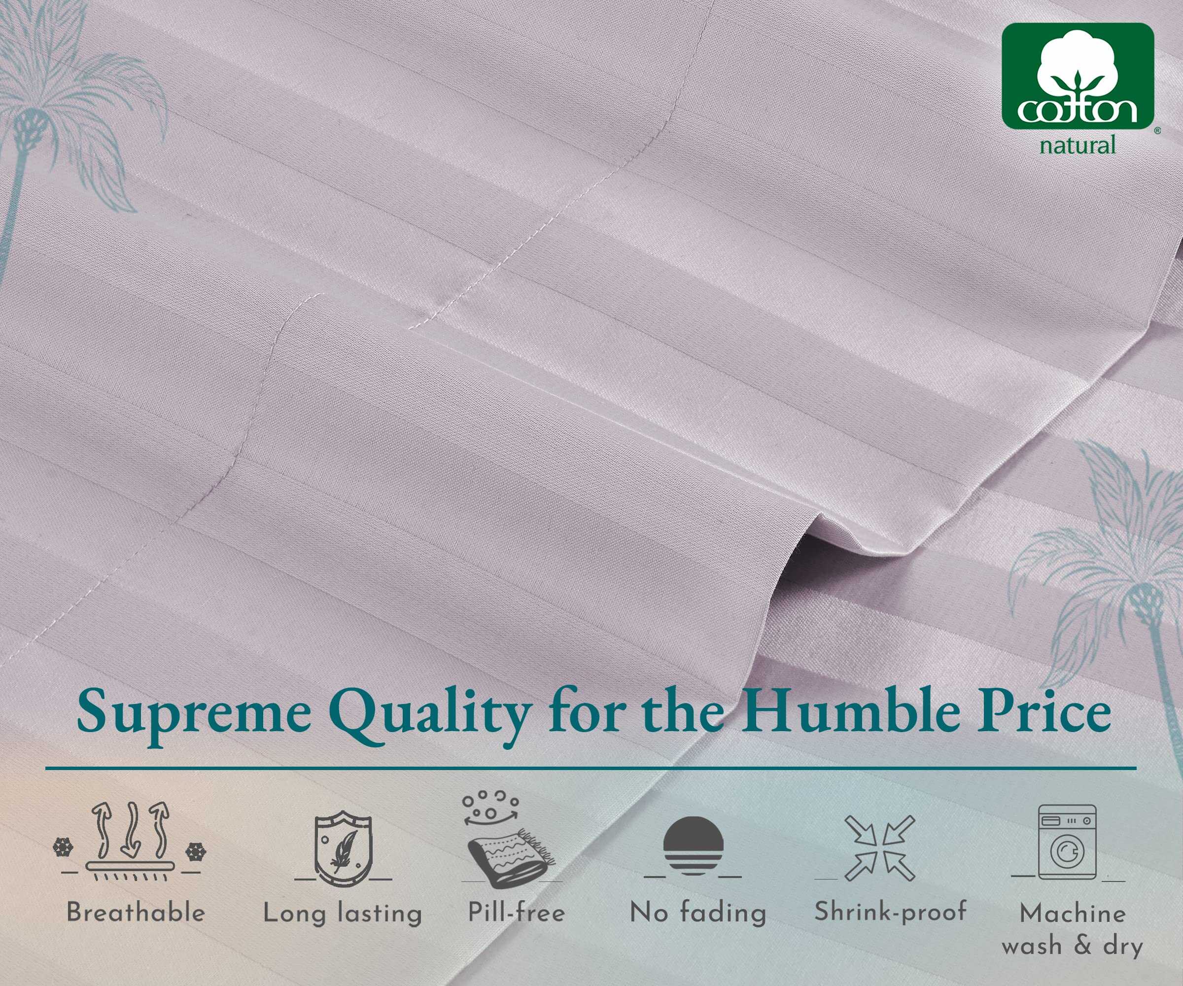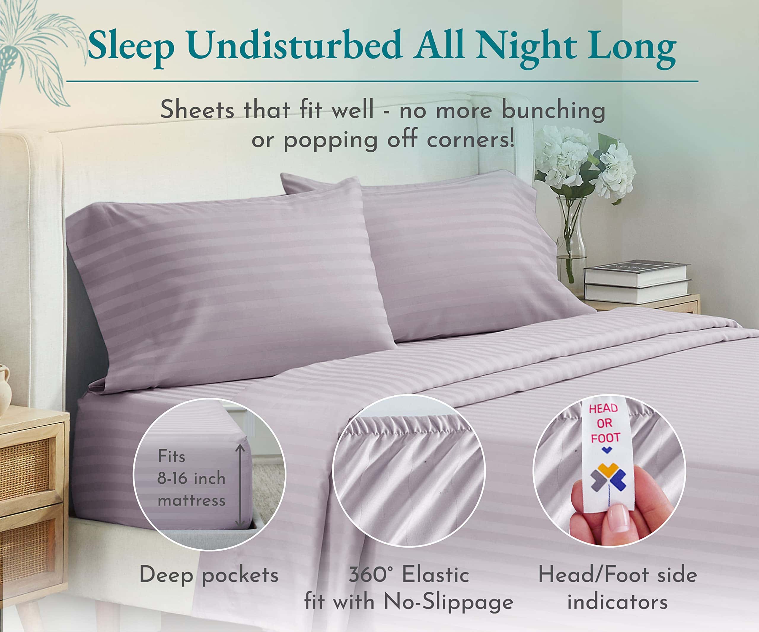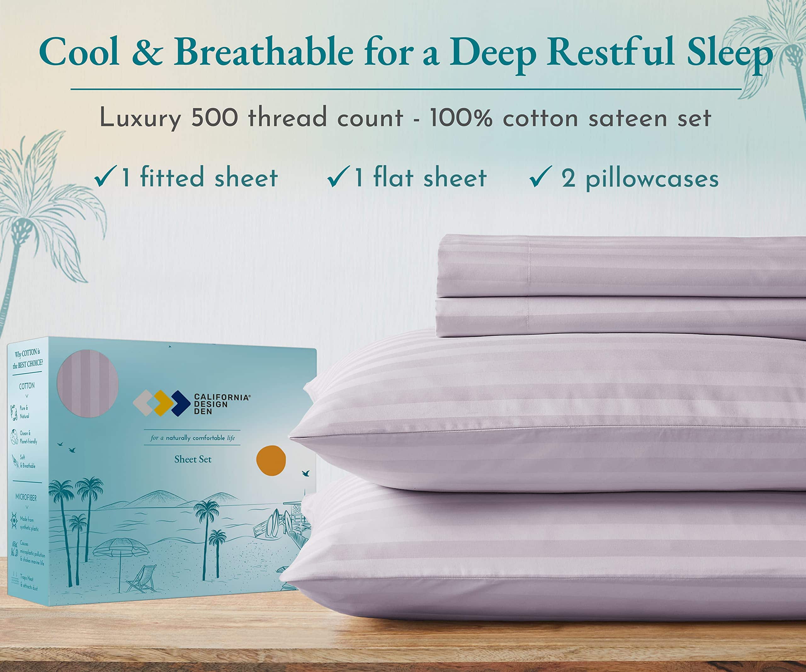 Transforma tu experiencia de dormir con nuestras lujosas sábanas de 500 hilos, hechas de satén de algodón 100%. Experimenta la ultima suavidad, comodidad y transpirabilidad que te mereces, para una buena noche de sueño que te deje sintiéndote renovado y enérgico por la mañana. Actualiza tu dormitorio con nuestro elegante juego de sábanas de algodón a rayas para una noche de sueño acogedora y confortable. Invertir en nuevas sábanas es una gran decisión. Pero con tantas marcas haciendo afirmaciones inverificables de algodón egipcio, puede resultar abrumador saber en cuál confiar. Nuestras sábanas de lujo certificadas de 500 hilos garantizan una inversión inteligente. Duraderas, cómodas y hechas para durar años, puedes dormir tranquilo sabiendo que tomaste la decisión correcta. Obtén el ajuste perfecto con todas las sábanas de algodón para cama queen. Estas sábanas ligeras y aireadas absorben la humedad y promueven un sueño profundo y reparador. Perfectas para quienes duermen calientes, son naturalmente frescas y amigables con la piel. Utilizamos algodón de fibra extra larga que las hace suaves y agradables al tacto. Fabricadas para durar, estas lujosas sábanas inspiradas en Italia te dejarán sintiéndote renovado y rejuvenecido cada mañana. Nuestra sábana ajustable está diseñada para adaptarse a colchones de hasta 16 pulgadas de profundidad. ¡No más acumulación o esquinas que se desprenden! Con elástico duradero en todo el contorno y un indicador de cabeza/pie para facilitar la hechura de la cama, te encantará la comodidad. Nuestro juego de 4 piezas tamaño queen incluye tela libre de manchas, decoloraciones, agujeros y pelusas, fiel al color. ¡Obtendrás la comodidad que te mereces durante años! Disfruta del lujo de las sábanas de algodón 100% para un sueño confortable. El Wall Street Journal confirma que «Las sábanas de algodón de California Design Den son tan suaves y bien hechas como otras sábanas de algodón que cuestan más de tres veces su precio». Nuestras sábanas son lavables a máquina, fáciles de mantener y certificadas por Oeko-Tex para tu seguridad. Además, si no estás satisfecho, puedes devolverlas dentro de los 30 días según las pautas. ¡Consigue hoy sábanas de alta calidad tamaño queen y disfruta la comodidad!