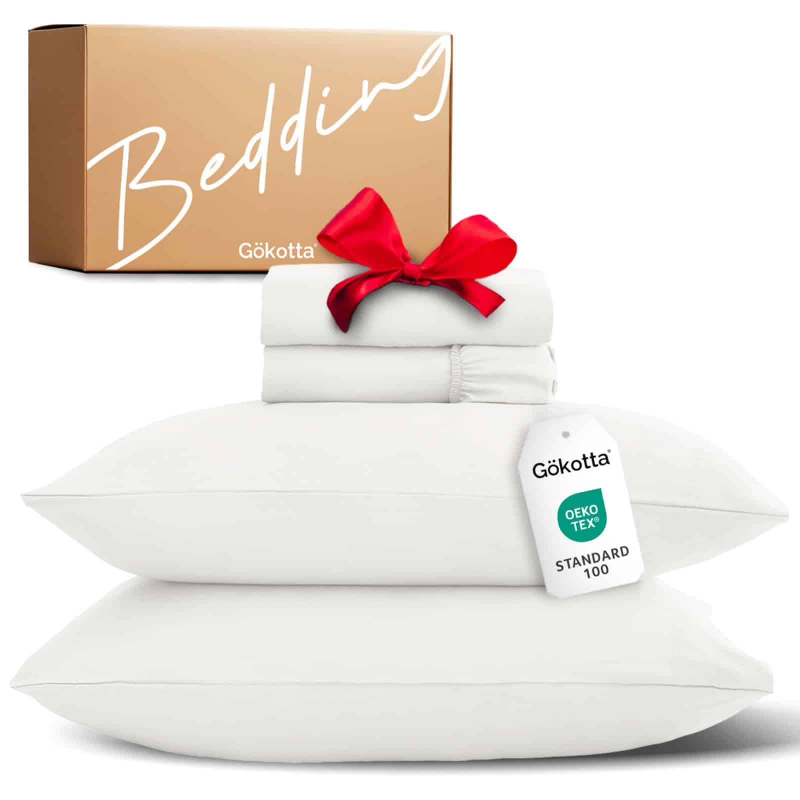 4. SÁBANAS CALIFORNIA KING DE BOLSILLO PROFUNDO – Este juego de sábanas california king incluye 1 sábana plana (108 x 102 ), 1 sábana ajustable (72 x 84 ), y 2 fundas de almohada estándar (20 x 36 ). Los bolsillos de 16″ de profundidad se ajustarán a la mayoría de los colchones, incluidos aquellos combinados con toppers. El dobladillo de 8″ de profundidad de las fundas de almohada mantendrá tus almohadas en su lugar, ¡nunca deslizándose!.
