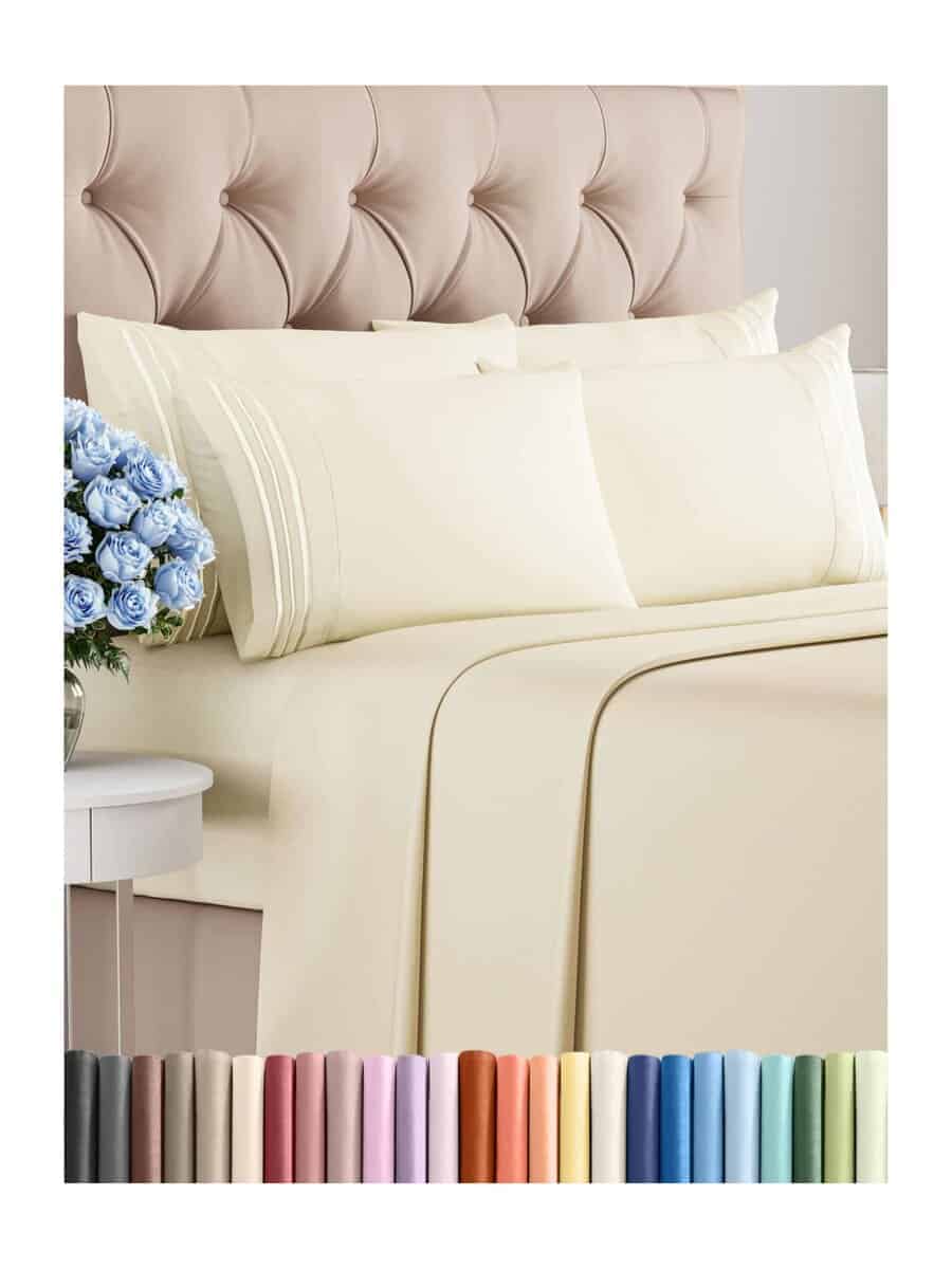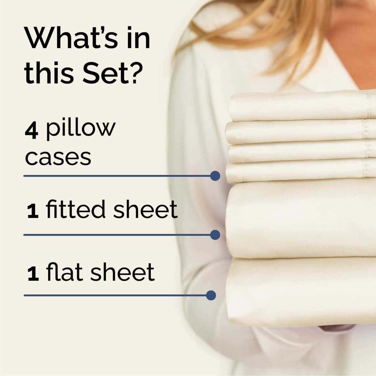 Juego de sábanas California King de 6 piezas – Cómodo, transpirable y fresco – Ropa de cama de lujo para mujeres, hombres, niños y adolescentes – 1 sábana plana y 1 ajustable y 4 fundas de almohada con bolsillos profundos – Suave y sin arrugas – Blanco. Este juego de sábanas de 6 piezas incluye 4 fundas de almohada, 1 sábana plana y 1 sábana ajustable. La sábana plana tiene unas dimensiones de 102 x 108 y la sábana ajustable mide 72 x 84 con 4 fundas de almohada de 20 x 40. Los bolsillos profundos permiten un ajuste fácil en colchones de hasta 16 pulgadas de profundidad. Estas sábanas son muy suaves, transpirables y sedosas, superando a las sábanas de algodón egipcio y orgánico en comodidad. Son ideales para cualquier habitación, incluidas habitaciones de huéspedes, dormitorios, habitaciones de niños y casas rodantes. Hechas de microfibra cepillada de alta calidad, estas sábanas California King ofrecen un toque suave y lujoso. Son una excelente opción en cuanto a precio y calidad, brindando comodidad y suavidad a un precio asequible. Cada juego de sábanas incluye sábanas planas, sábanas ajustables y fundas de almohada extra para una experiencia completa y lujosa.