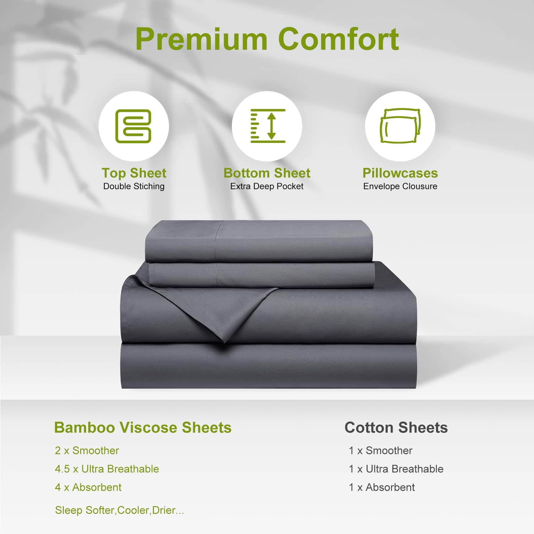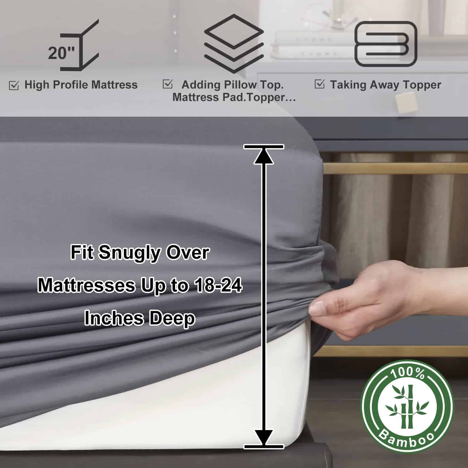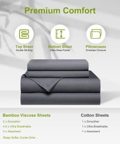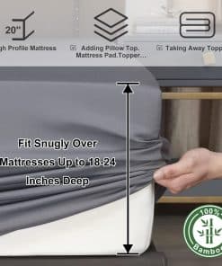 El juego de sábanas de nuestro juego Queen es suave como el mejor algodón o seda. Puede ajustarse a la temperatura de tu cuerpo, manteniéndote fresco y relajado mientras duermes y proporcionando comodidad durante todo el año. Tiene propiedades muy rápidas de absorción que permiten que sea 3-4 veces más absorbente que el algodón, lo que significa que te mantendrás más fresco en verano y en invierno las telas son cálidas pero al mismo tiempo permiten más aire entre tu piel y el colchón, evitando el sobrecalentamiento. Nuestras sábanas Queen de bolsillos extra profundos tienen bolsillos extremadamente profundos de hasta 18″-24″ que se estiran y se ajustan mejor que cualquier otro juego de sábanas. El juego de sábanas de cama Queen de lujo está diseñado para adaptarse a casi todos los colchones, especialmente a los colchones gruesos, colchones con doble almohadilla, toppers de espuma viscoelástica, grandes almohadillas de colchón o colchones de aire. El juego de sábanas California King de 4 piezas incluye 1 sábana plana (108″x102″), 1 sábana ajustable (72″x84″) y 2 fundas de almohada (20″x40″). Nuestra sábana ajustable de enfriamiento tiene 20 pulgadas de profundidad y puede estirarse para adaptarse al colchón de hasta 24″. Una banda elástica que abraza todo alrededor puede mantenerlas en su lugar y brindarte un sueño reparador perfecto. El juego de sábanas de textura sedosa es más suave que las sábanas de algodón egipcio y está diseñado para suavizarse con cada lavado asegurando noches cada vez más acogedoras con el tiempo. Estas sábanas Queen de bolsillos extra profundos son duraderas y se pueden lavar a máquina, resistentes a la contracción y decoloración. Lava tus sábanas en agua fría en un ciclo suave, sécalas al aire o en la secadora a baja temperatura. A diferencia de otros materiales, la viscosa de bambú en forma textil es capaz de retener muchas de las propiedades que tiene como planta, con un caída natural suave especialmente si la sacas del secador rápidamente.