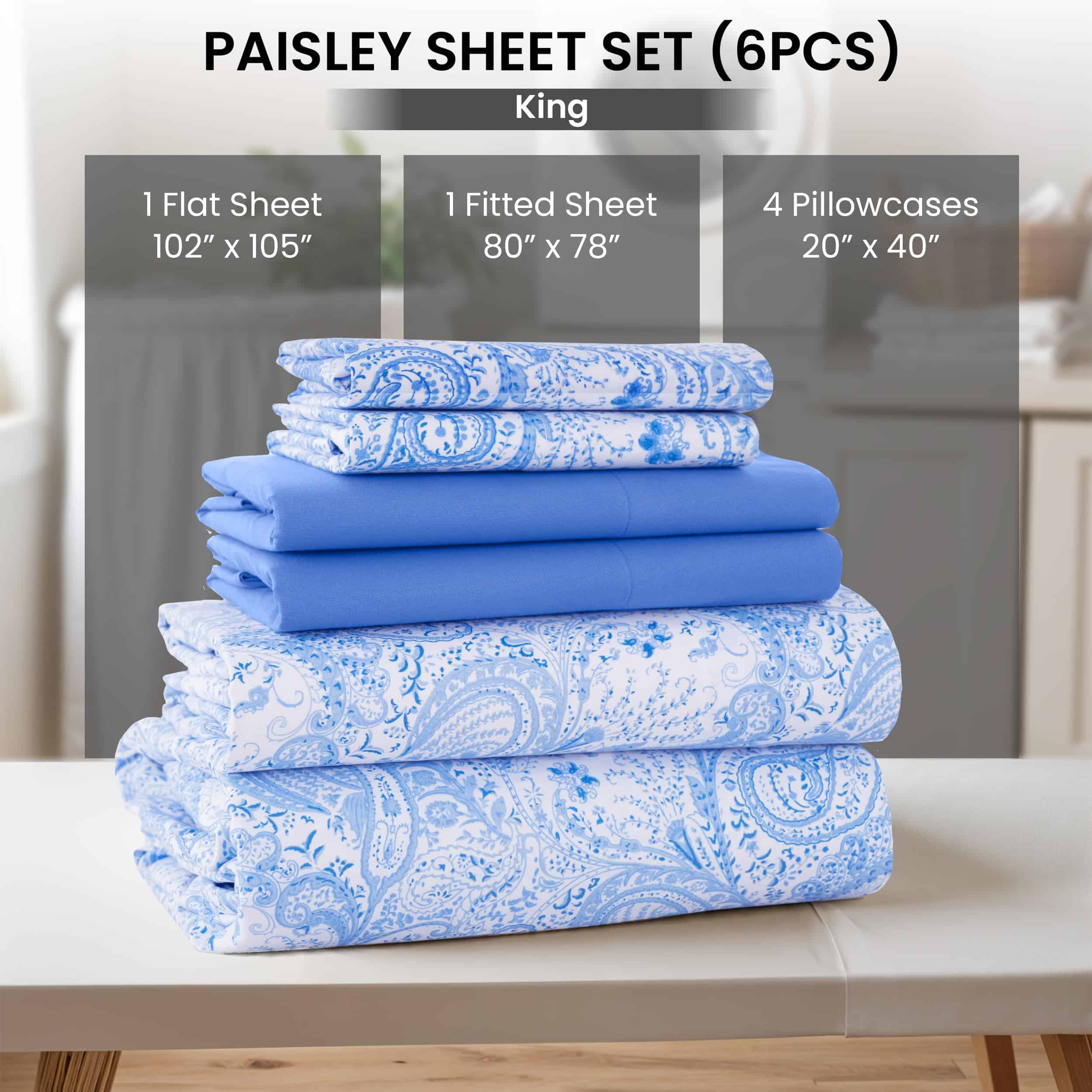1. JUEGO DE SÁBANAS DE 6 PIEZAS: Nuestro juego de sábanas para cama Cal King incluye 1 Sábana Plana (102×108 pulgadas), 1 Sábana Ajustable (84×72 pulgadas) y 4 Fundas de Almohada (20×40 pulgadas).
