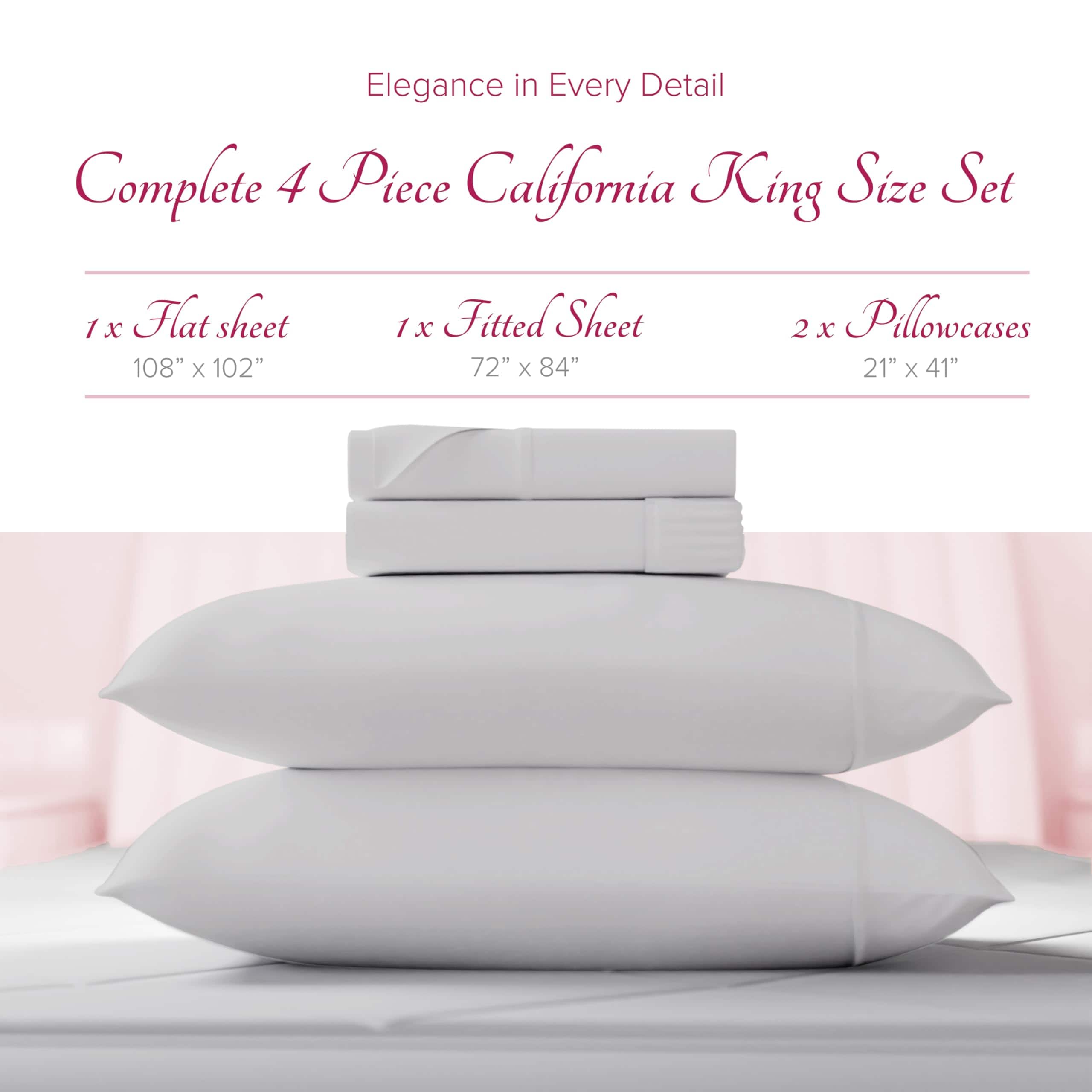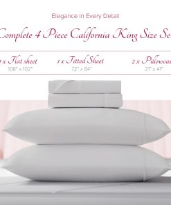 4. Incluye un completo y bien ajustado juego de 4 piezas: El juego de sábanas de algodón egipcio tamaño California King incluye 4 piezas – 1 sábana plana (102″ x 108″), 1 sábana ajustable (72″ x 84″ + 17″), y 2 fundas de almohada tamaño king (21″ x 41″). La sábana ajustada elastizada viene con un bolsillo extra profundo de 17 pulgadas para adaptarse fácilmente a colchones regulares y altos de hasta 19 pulgadas. Las fundas de almohada tienen un cierre abierto para que las almohadas grandes puedan deslizarse fácilmente.