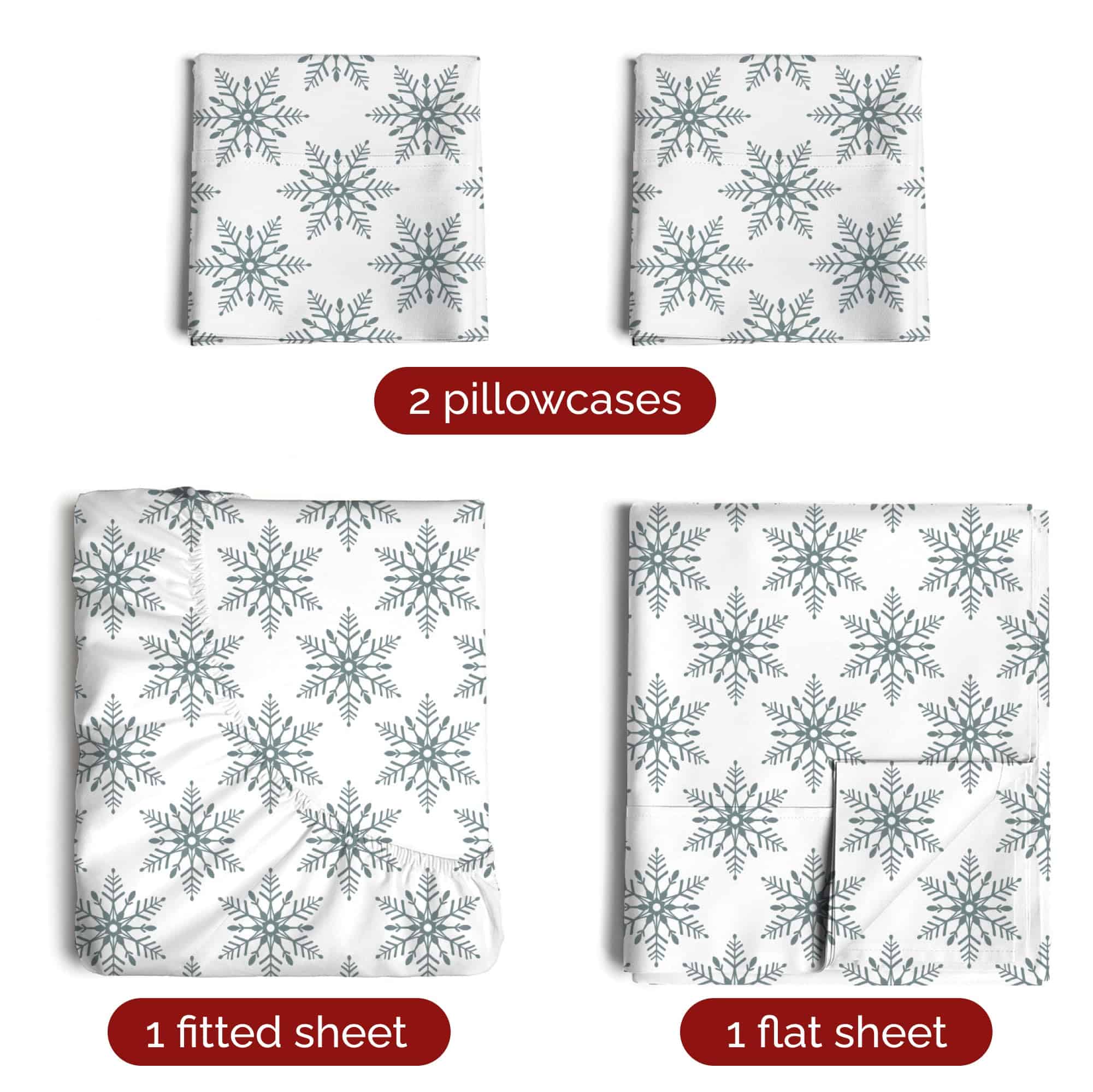 1. ¡Tenga una temporada navideña muy alegre con nuestro juego de sábanas navideño de 4 piezas! 2 fundas de almohada, 1 sábana plana y sábana ajustable. Sábana Plana (108″ x 102″) Sábana Ajustable (80 x 78) 2 Fundas de Almohada (20 x 40).
