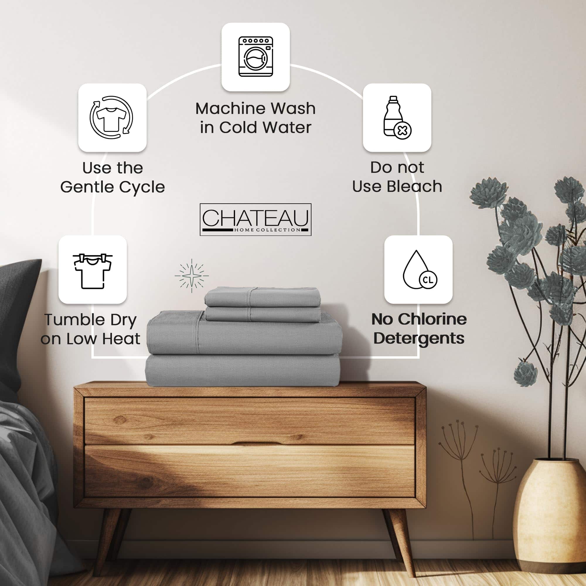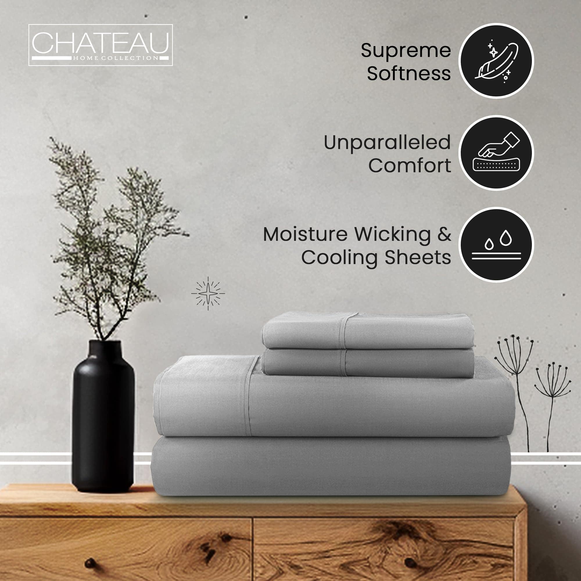 Renueve su dormitorio con este juego de sábanas CHATEAU HOME COLLECTION de Tencel Cotton. Con una increíble suavidad y transpirabilidad gracias a sus 300 hilos, estas sábanas certificadas Oeko-TEX ofrecen una experiencia de sueño de lujo. El color plateado agrega un toque de elegancia a su habitación. Se ajustan perfectamente a colchones de hasta 17 pulgadas de grosor. ¡Experimente la frescura y comodidad de estas sábanas refrescantes en su cama! Disfrute de la calidad y el estilo incomparables de CHATEAU HOME COLLECTION.