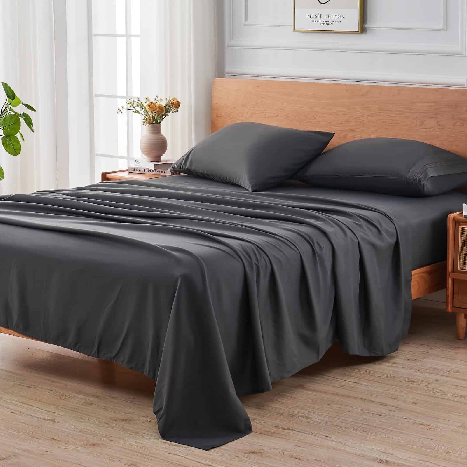 3. Dimensiones de Confort Elegante: Sábana plana 102″ x 108″, sábana ajustable 78″ x 80″, y dos fundas de almohada king 20″ x 40″. La sábana ajustable tiene bolsillos profundos y está completamente elastizada, encajando en colchones de hasta 15 pulgadas de grosor. Estas sábanas son resistentes a las arrugas y a la decoloración, se pueden lavar a máquina en agua fría y secar rápidamente.