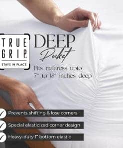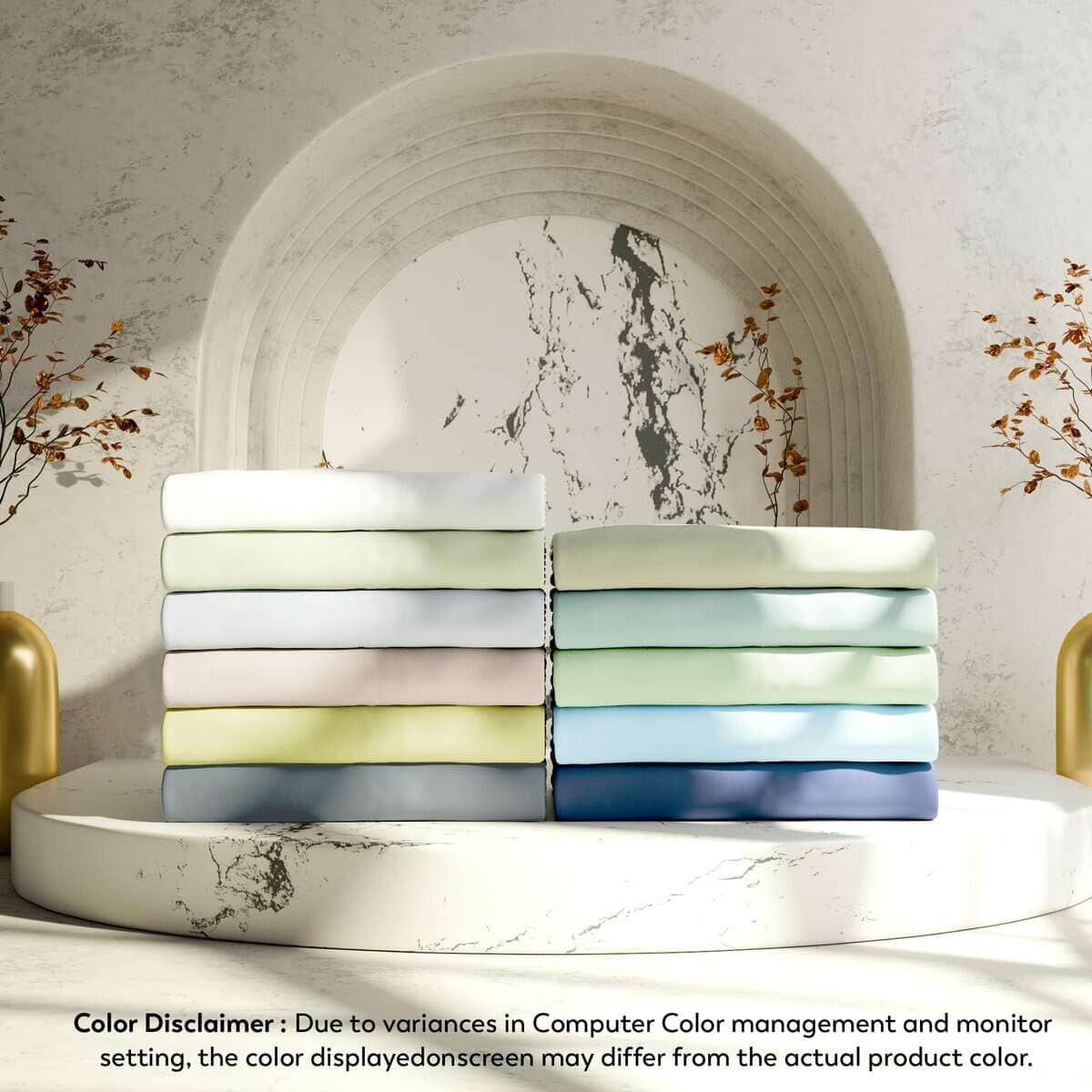 Las sábanas de la familia SUPREME ELEGANCE, que incluye Purity Home, están hechas de materiales premium y sostenibles para una experiencia de vida refinada y eco-consciente. Nuestro juego de sábanas completo incluye 1 sábana plana (82 pulgadas de ancho x 96 pulgadas de largo), 1 sábana ajustable (54 pulgadas de ancho x 75 pulgadas de largo) y 2 fundas de almohada estándar (20 pulgadas de ancho x 30 pulgadas de largo) para satisfacer mejor tus necesidades. La sábana ajustable cuenta con la tecnología de ajuste True Grip patentada con un elástico tipo boxer de 1 pulgada en los bordes y elástico de 1/2 pulgada en la caída, proporcionando un ajuste ceñido para colchones de diferentes profundidades. También cuenta con una «Etiqueta inteligente de cabeza/pie» para una fácil identificación de los lados. Instrucciones de cuidado lavado: Nuestras sábanas refrigerantes, fabricadas con un tejido de percal, son conocidas por su notable durabilidad y excepcional comodidad. Son convenientemente lavables a máquina, manteniendo su color y volviéndose más suaves con cada lavado. Sin embargo, para mantener las arrugas a raya, retira rápidamente las sábanas y fundas de almohada de la secadora o plánchalas. Ropa de cama de cuidado fácil para estilos de vida ocupados.