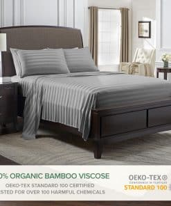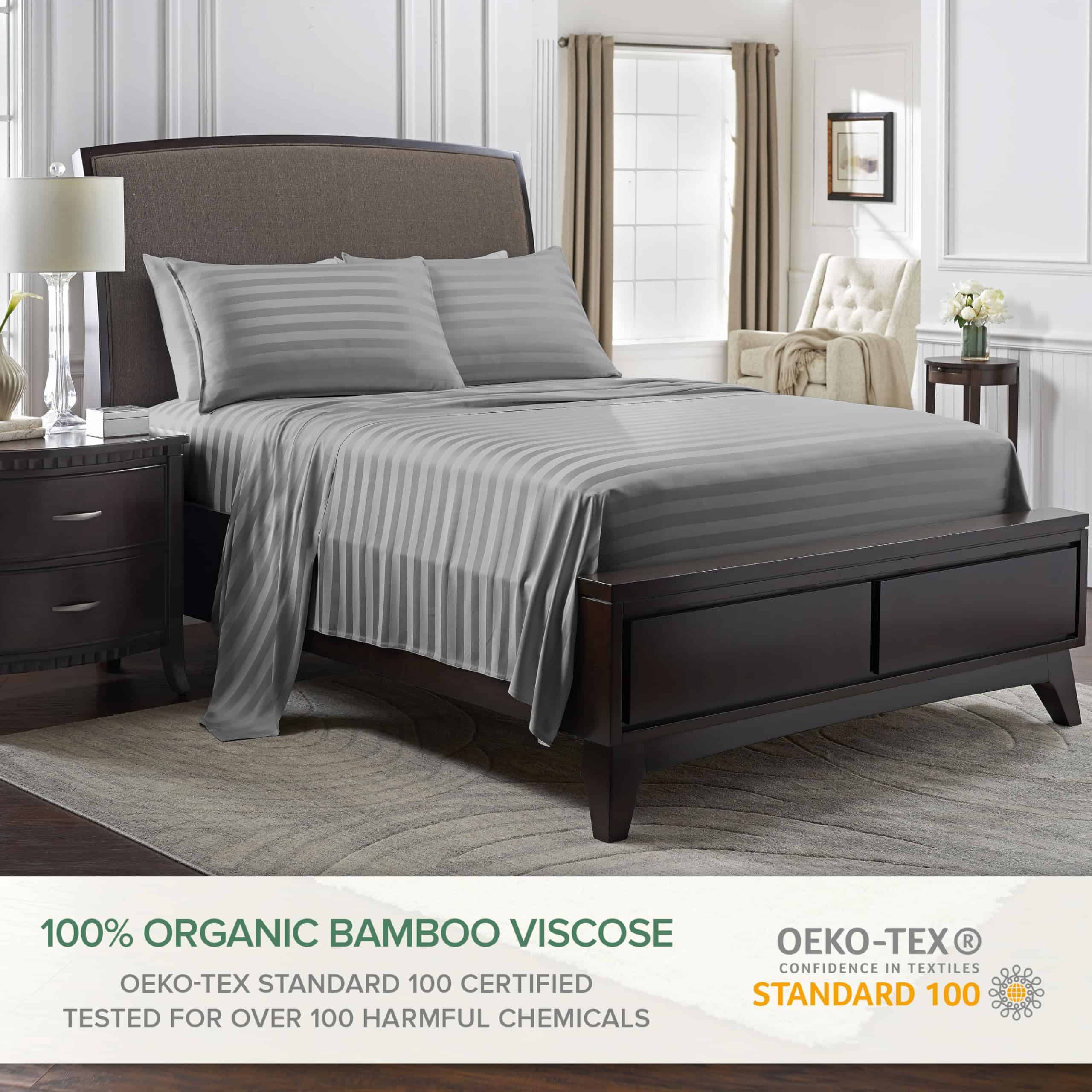 Crafted from the finest quality luxuriously soft GENUINE 100% ORGANICALLY GROWN VISCOSE DERIVED FROM BAMBOO and are OEKO-TEX Standard 100 Certified and tested to be free from over 100 harmful substances, ensuring that it is safe and healthy for your family. Our bed sheets are never blended with other fibers or fabrics unlike most competitors. The Viscose derived from bamboo fabric is naturally thermo-regulating to keep you cool and relaxed while sleeping and providing all-season comfort. The moisture-wicking properties of our resort-grade bedding is perfect for hot sleepers or those with sensitive skin while indulging in the ultimate luxurious softness. Fabric made from 300 thread count sateen weave for a softer, smoother, and more silky feel than even the highest thread count cotton sheets. Deep fitted pockets with fully elasticized border for a snug fit on any mattress up to 16 inches thick. Quality sewn double-stitched seams for long-lasting durability and easy care with cold water washing. Lifetime Guarantee against defects in materials and craftsmanship. Designed in Florida and Imported from China. All fabric subjected to rigorous testing standards for flammability, heavy metals, and phthalates. Enjoy the sensuous silky feel that grows luxuriously softer with every wash.