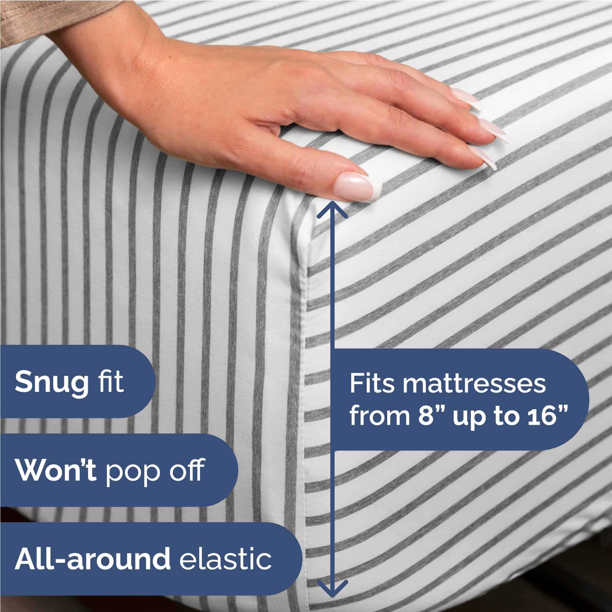 2. BOLSILLOS PROFUNDOS / AJUSTE FÁCIL: Se ajustan a colchones de hasta aproximadamente 16 pulgadas de profundidad. Si su colchón es más pequeño que 16 pulgadas, se ajustará perfectamente. Un montón de colchones son bastante grandes en la actualidad y creemos que este es un tamaño universal que se ajusta a la mayoría de los colchones.