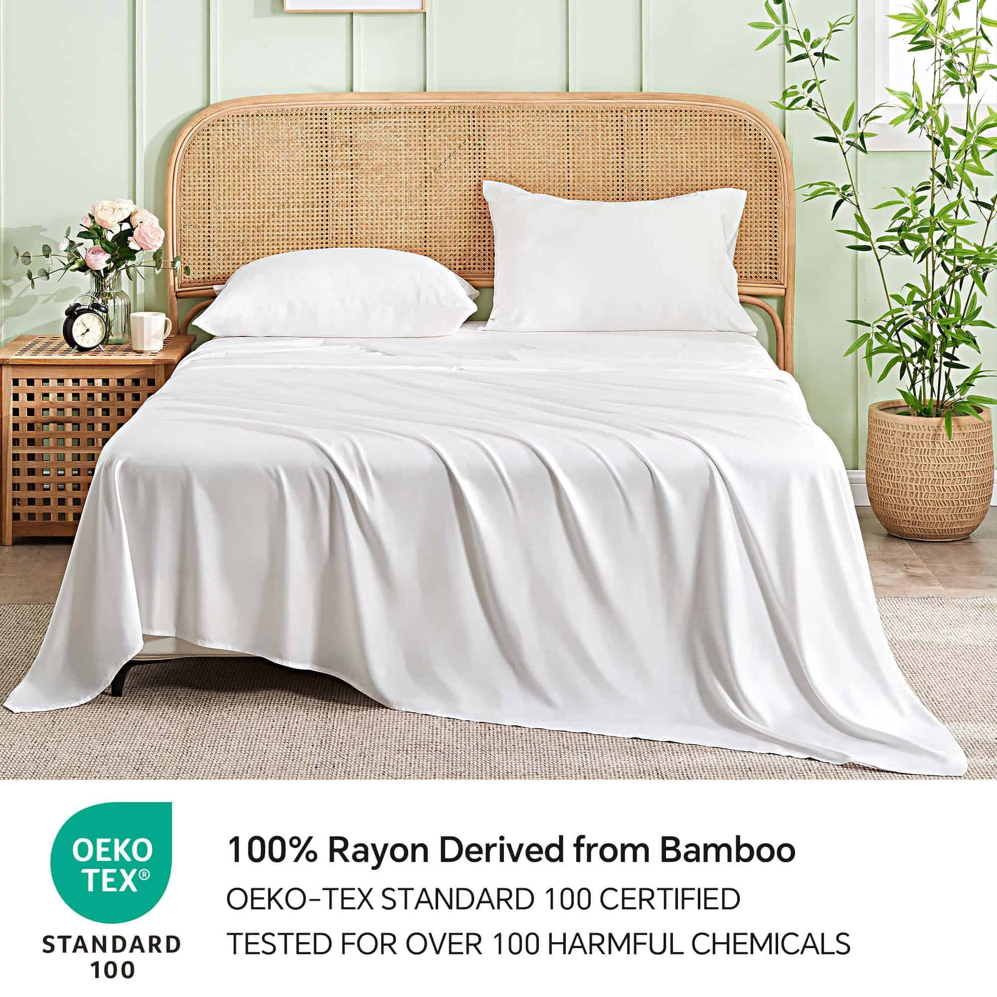 1. SUAVIDAD SEDOSA: Nuestro Juego de Sábanas está hecho de 100% Rayon derivado de Bambú, con un tejido de sarga distintivo que mejora la durabilidad de las sábanas en comparación con el algodón, manteniendo una sensación suave y lujosa similar a la seda. Experimenta una sensación de dormir en las nubes con nuestras sábanas suaves. 2. CERTIFICADO OEKO-TEX: Nuestro Juego de Sábanas ha pasado rigurosas pruebas de más de 100 sustancias dañinas, garantizando la seguridad y la salud de tu familia. 3. JUEGO DE SÁBANAS COMPLETO DE 4 PIEZAS PARA CAMA MATRIMONIAL: Este Juego de Sábanas completo incluye 2 Fundas de Almohada con Cierre de Envoltura (20″ x 30″), 1 Sábana Plana (81″ x 96″) y 1 Sábana Ajustable (54″ x 75″). 4. SUAVIDAD REFRESCANTE y CONFORT TRANSPIRABLE: El 100% Rayon derivado de Bambú es conocido por sus propiedades naturales de regulación térmica, garantizando una experiencia de dormir fresca y relajada con confort durante todo el año. Las capacidades de absorción de la humedad de nuestro juego de sábanas lo hacen ideal para personas que tienden a sentir calor durante el sueño o tienen piel sensible. 5. CUIDADO FÁCIL DE LAVADO: Nuestro Juego de Sábanas posee una excelente durabilidad y es lavable a máquina. Se recomienda lavar en agua fría usando un ciclo suave y secar a baja temperatura.