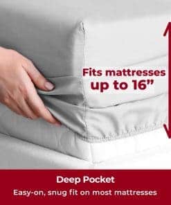 4. Calidad y construcción incomparables: los bolsillos profundos en la sábana ajustable caben en colchones de hasta 16″ de profundidad. Elástico cosido alrededor para poner y quitar fácilmente, con un ajuste ceñido para permanecer en su lugar mientras duermes. Cada componente de este producto certificado por OEKO-TEX (número de certificado 22.HUS.40981 probado por Hohenstein) ha sido probado contra una lista de más de 1,000 sustancias para mantener seguros a ti y a tu familia.