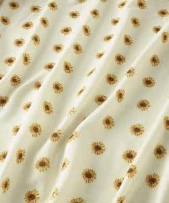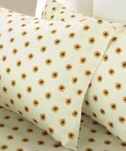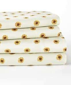 Agrega un toque floral a cualquier habitación con este Juego de sábanas con diseño de girasoles y fundas de almohada a juego. Este conjunto de cuatro piezas incluye una sábana plana, una sábana ajustable y dos fundas de almohada a juego. La sábana ajustable se adapta a colchones de hasta 14″ de grosor. Son suaves y cómodas para dormir durante toda la noche. Cuando estén sucias o estés cambiando las sábanas de temporada, simplemente lávalas a máquina y luego reemplázalas o guárdalas para la temporada. Poliéster. Lavado a máquina. El juego incluye: Sábana plana – Sábana ajustable – 2 Fundas de almohada