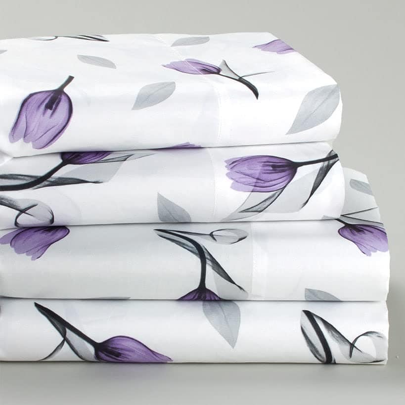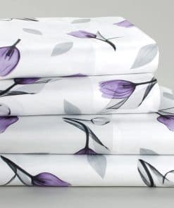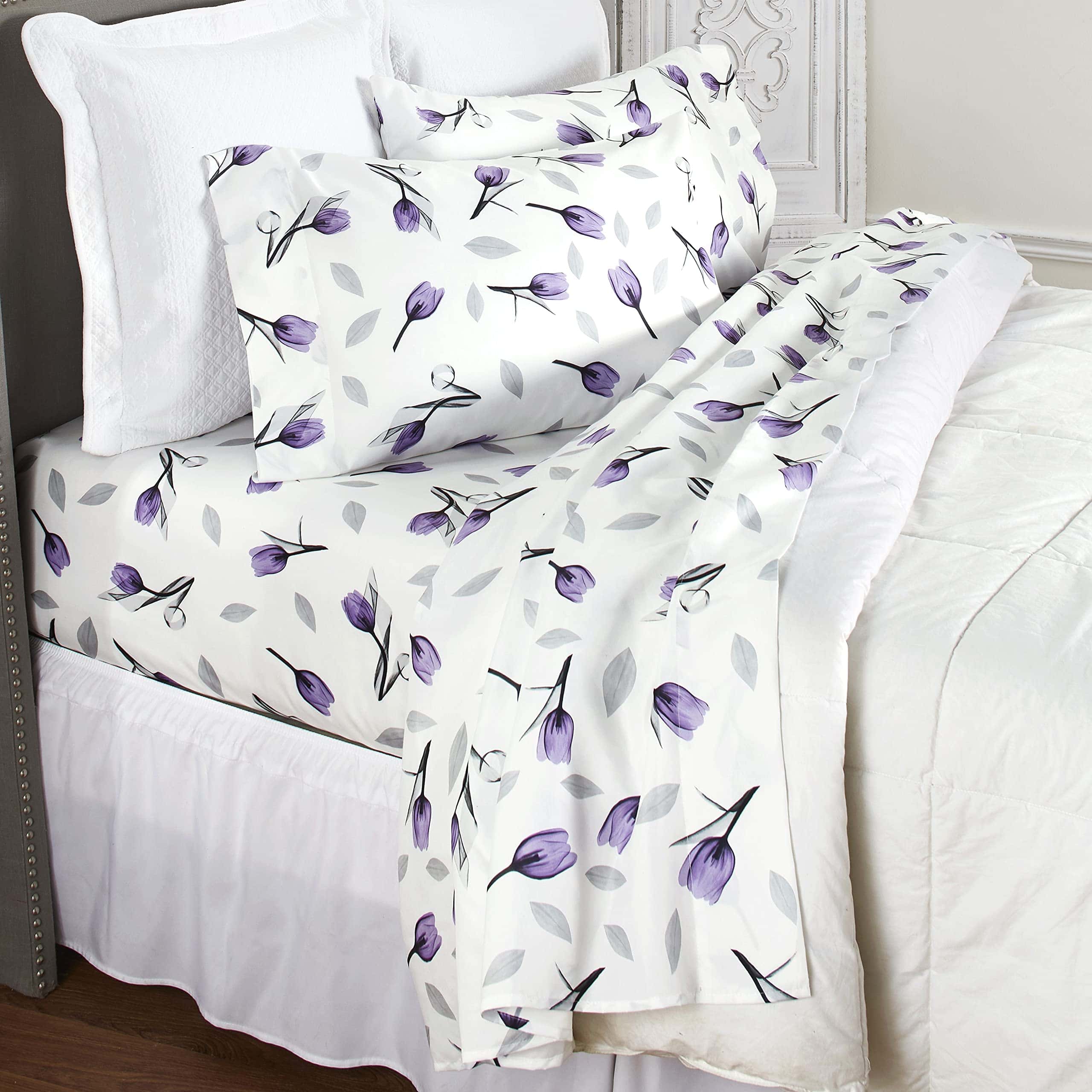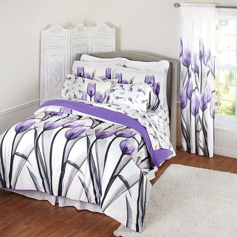 Este juego incluye un estampado de tulipanes morados y grises en todo el set sobre un fondo blanco. Úsalo en tu propio dormitorio o ponlo en la cama de un niño para agregar un simple acento floral a cualquier dormitorio. La sábana ajustable es para colchones de hasta 14 pulgadas. Poliéster. Lavable a máquina. El juego incluye 1 sábana plana, 1 sábana ajustable y 2 fundas de almohada. El juego de sábanas tamaño King incluye fundas de almohada tamaño King.