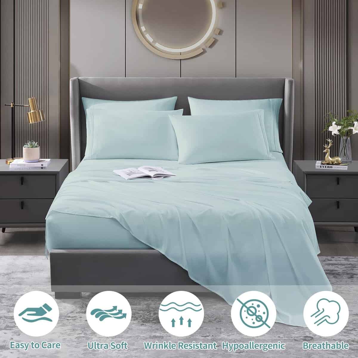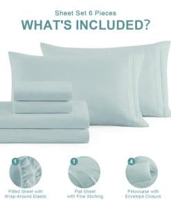 Juego de sábanas Queen de 6 piezas: Nuestra sábana queen viene con 4 fundas de almohada (20×30»), 1 sábana ajustable (60 80 16») y 1 sábana plana 90 102». Además, la sábana adopta un diseño plisado, con una apariencia sencilla y elegante. Haz que tu cama luzca más ordenada.