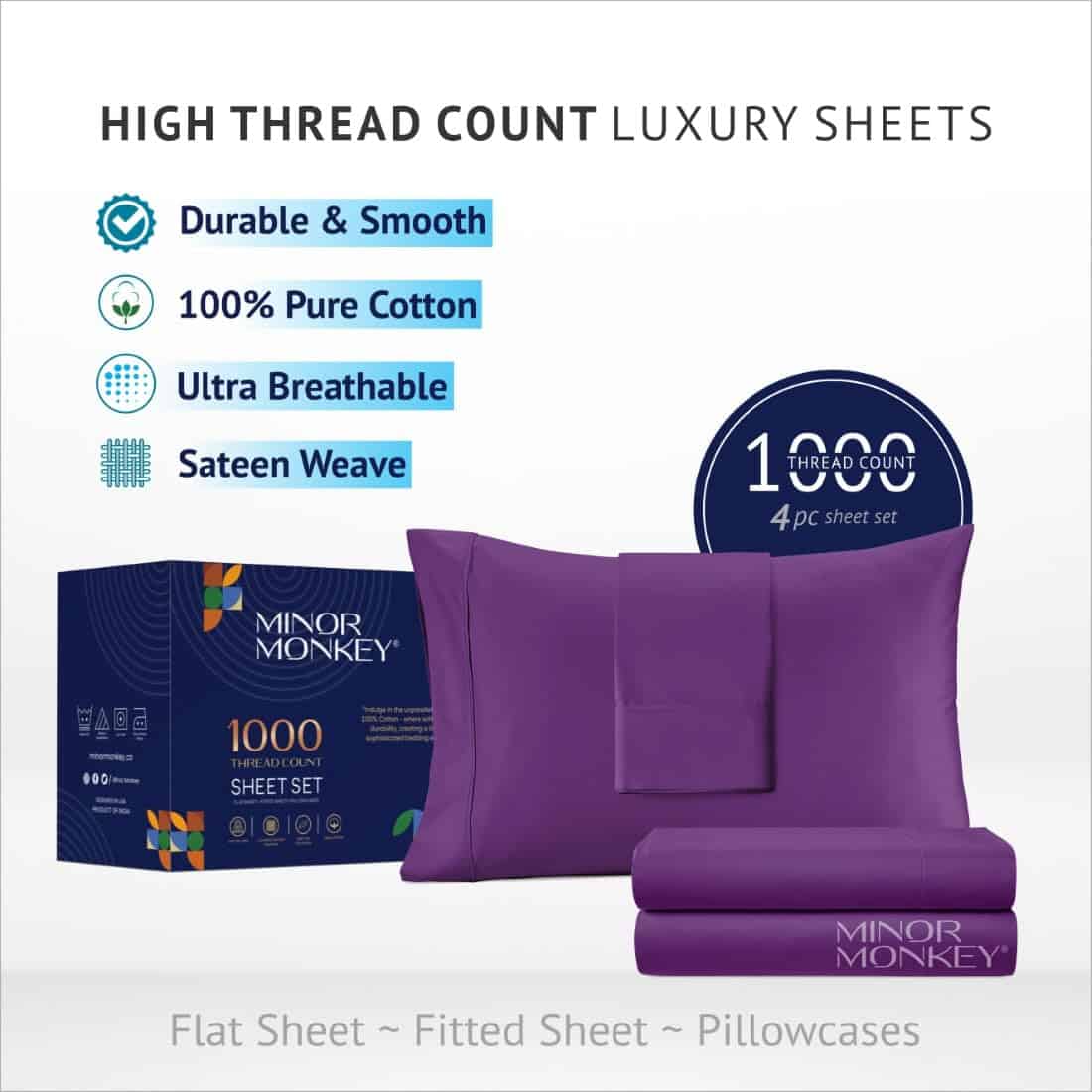 3. Experiencia de lujo con algodón – Estas sábanas de algodón están hechas de 100% algodón egipcio, famoso por su suavidad y durabilidad excepcionales. Las fibras de largo mechón del algodón egipcio crean hilos más fuertes y más finos, lo que resulta en estas sábanas de algodón de 1000 hilos que son resistentes a la formación de bolitas y mantienen su calidad con el tiempo.