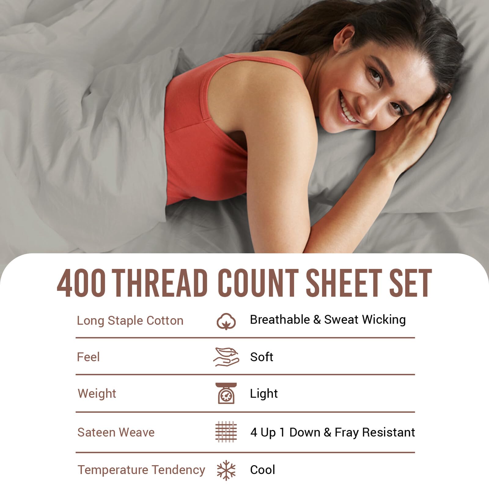 1. Amigable con la piel, fresco y suave: Elaboradas con 100% algodón peinado de hilo largo en tejido de satén de 400 hilos, este juego de sábanas tamaño King con su textura ligera está hecho con hilo especialmente compactado. Un procesamiento mínimo hace que este juego de sábanas sea suave para todo tipo de piel, evita sudores nocturnos, absorbe la humedad y regula la temperatura corporal para dormir fresco manteniendo un elegante aspecto de hotel.