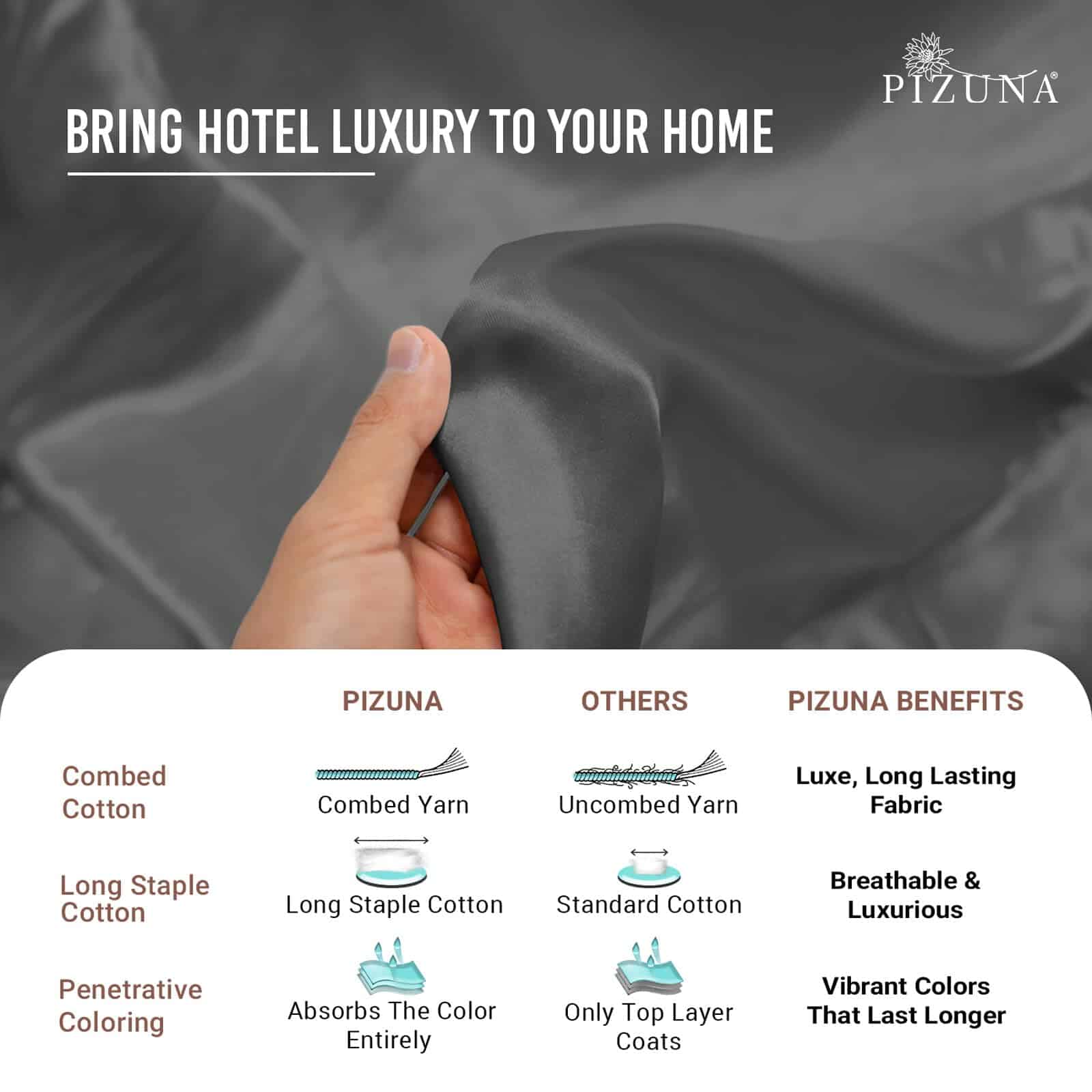El juego de sábanas tamaño California King de la marca Pizuna está diseñado con algodón mercerizado combed 100% puro y natural de alta calidad. Confeccionado con técnica fina de hilatura de Pizuna, este juego de sábanas de 400 hilos presenta un tejido de satén sencillo (4 arriba-1 abajo). El uso de algodón peinado mercerizado hace que estas sábanas California King sean suaves y resistentes. La ropa de cama de algodón puro y natural se arruga, pero es distintivamente más fresca y transpirable. Además, se suaviza y las arrugas disminuyen con cada lavado. Los productos de Pizuna están certificados por OEKO-TEX y AZO-Free (2024), libres de sustancias sintéticas y respetuosos con el medio ambiente, lo que los hace aptos incluso para las pieles más delicadas. Estas sábanas son BSCI compliant, social y ambientalmente responsables. El uso de materiales reciclados para el embalaje puede producir un olor desagradable que desaparece tras el primer lavado en agua tibia. Fabricadas con tintes resistentes a la decoloración, son aptas para lavar a máquina en ciclo suave y secar a baja temperatura. El uso de lejía puede afectar los colores. Diseñadas para un mejor sueño, el equipo de expertos en sueño de Pizuna estudia el comportamiento y los patrones de sueño de los usuarios, lo que se traduce en una mejora del producto y un embalaje compacto. Disponibles globalmente en múltiples colores y tamaños, convierten a estas sábanas tamaño California King en la opción perfecta para regalar a tus seres queridos. Con miles de familias felices y medios de comunicación elogiando nuestro lujoso juego de sábanas de algodón, si no estás satisfecho con el producto, puedes devolverlo en un plazo de 30 días según la política, más allá de eso, nuestro equipo de atención al cliente estará allí para ayudarte también.