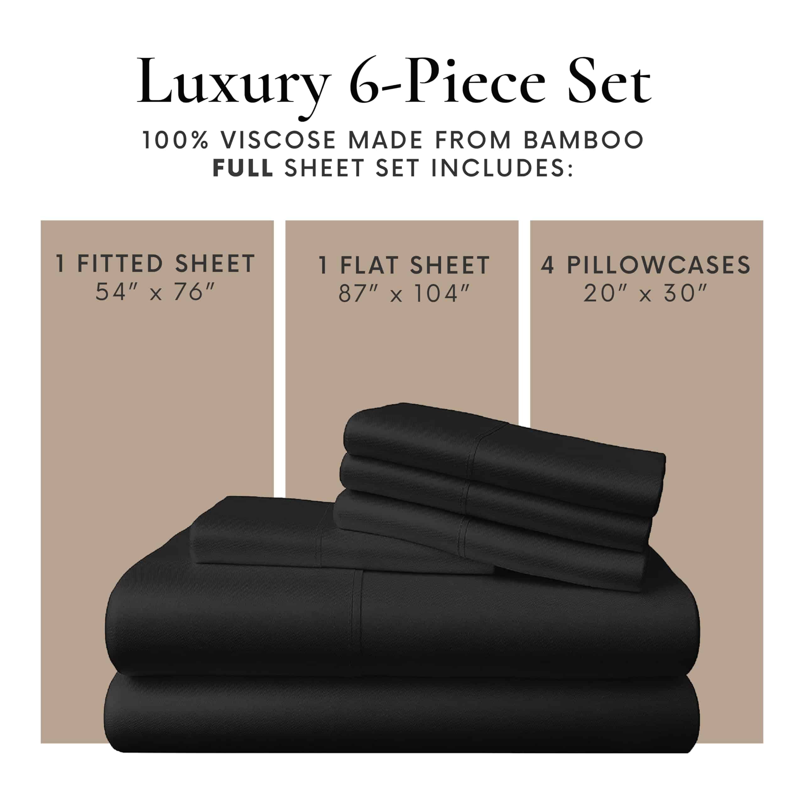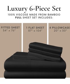 Juego de sábanas de viscosa de bambú 100% tamaño completo de 6 piezas que se adapta a un bolsillo de hasta 16″. Este juego incluye 1 sábana ajustable tamaño completo (54 x 76), 1 sábana plana tamaño completo (87 x 104) y 4 fundas de almohada tamaño queen (20 x 30). La sábana ajustable tiene bolsillos extra profundos que se adaptan a colchones de hasta 16″ de grosor con elástico fuerte y duradero para garantizar un ajuste perfecto y seguro. Estas suaves y lujosas sábanas están hechas de viscosa de bambú, lo que las hace resistentes y fáciles de cuidar. Transforma tu cama en un oasis de comodidad y estilo con este juego de sábanas tamaño completo de bambú.