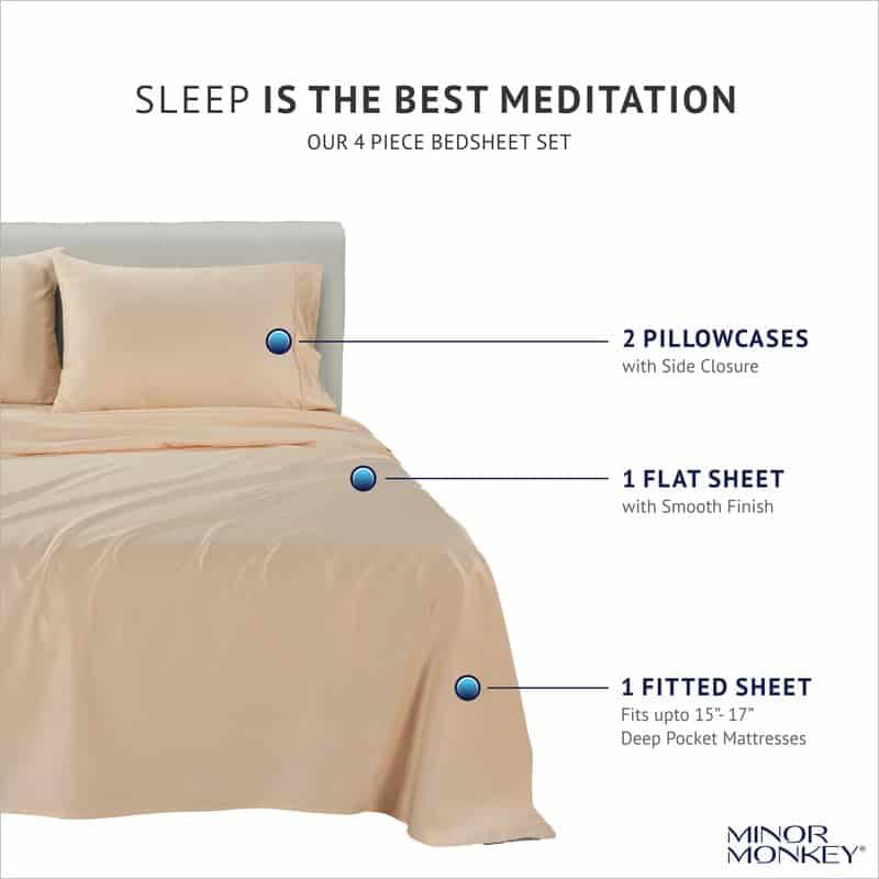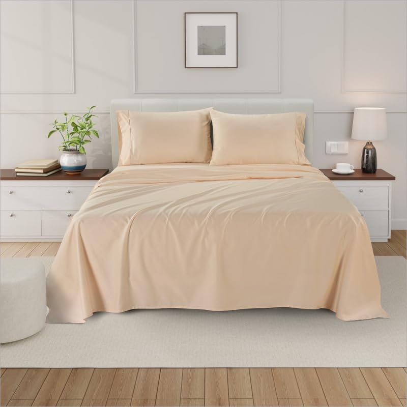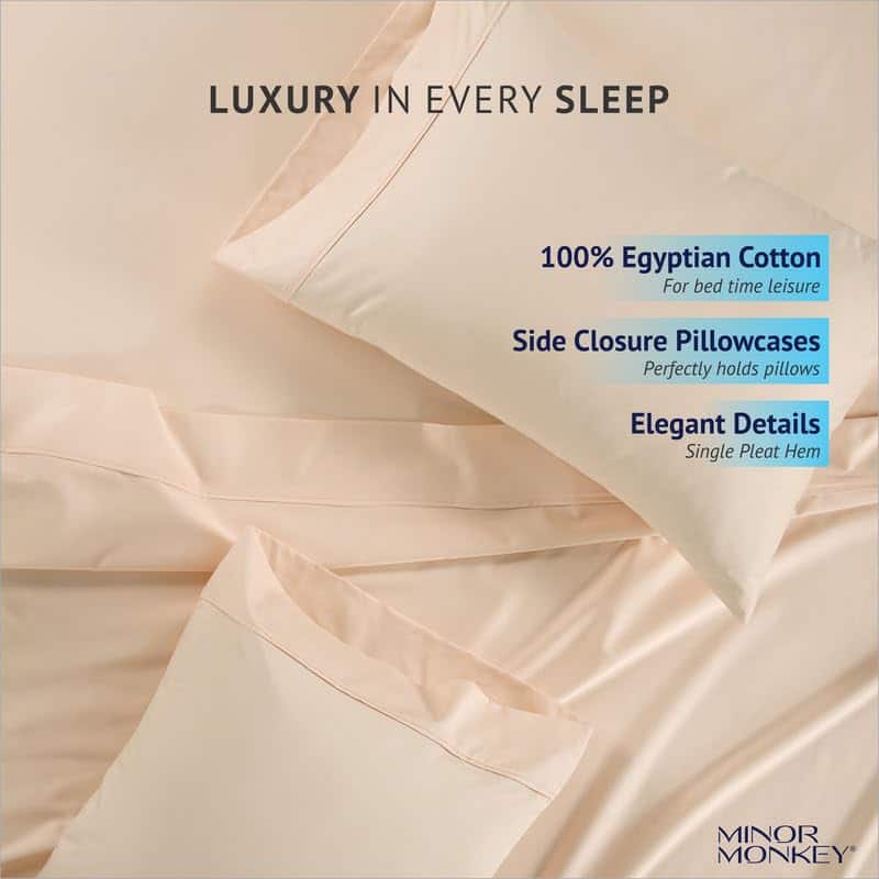 Nuestro juego de sábanas incluye una sábana ajustable que se adapta a colchones de hasta 16 pulgadas de profundidad, una sábana plana y dos fundas de almohada estándar a juego, lo que proporciona una cobertura total y una apariencia impecable en tu cama. El algodón egipcio de larga duración utilizado en la fabricación de nuestras sábanas es conocido por sus fibras más fuertes y finas, lo que resulta en una sábana que es resistente a la formación de bolitas y mantiene su calidad con el tiempo.