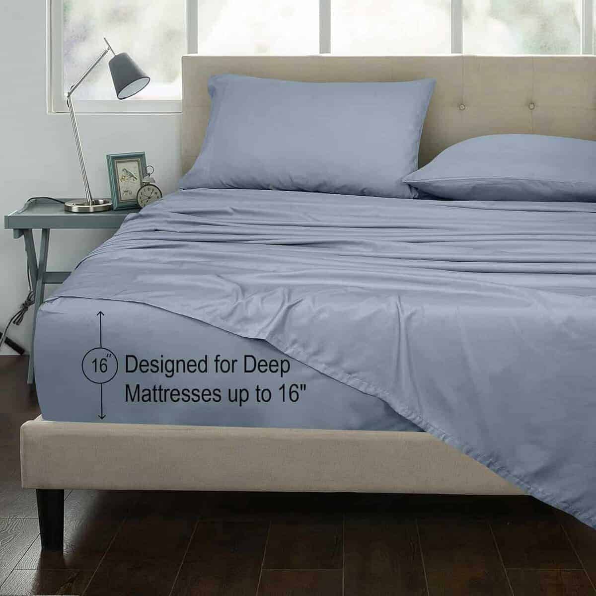 2. JUEGO DE SÁBANAS DE 300 HILOS Y 4 PIEZAS: Este juego de sábanas King de 300 hilos 100% algodón incluye: 1 sábana plana de 105×102 pulgadas, 1 sábana ajustable de 78×80 pulgadas con 16 pulgadas de caída y 2 fundas de almohadas de 20×40 pulgadas con dobladillo de 4 pulgadas y cierre tipo sobre.