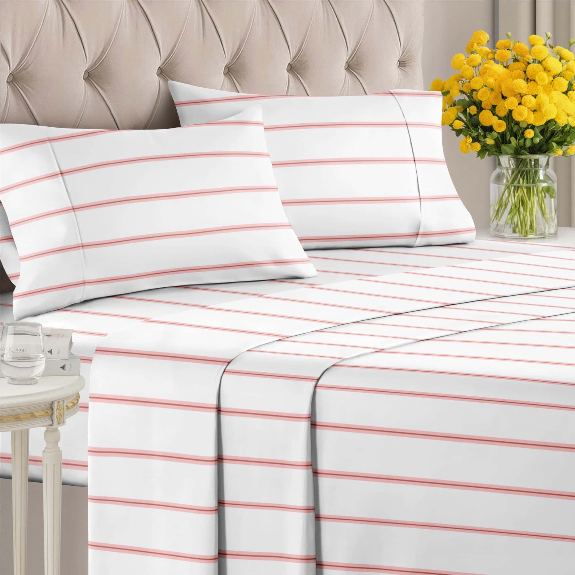 Juego de sábanas de 4 piezas a rayas rojas para cama Queen