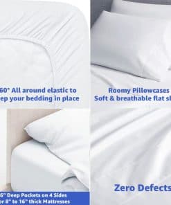 1. Juego de sábanas king size de 4 piezas: sábana bajera tamaño King (80″ x 78″ pulgadas), sábana plana tamaño King (108″ x 102″ pulgadas), fundas de almohada tamaño King (20″ x 40″ pulgadas). 2. Sábana bajera elástica completamente ajustada expertamente con elástico duradero que rodea toda la sábana bajera se ajustará perfectamente a todos los colchones de 8″ a 16″ de profundidad. 3. Tela: los juegos de sábanas están hechos de algodón compacto de alto grado 100% de fibra larga. ¡Son las mejores sábanas que poseerás! ¡Son SUAVES, ACOGEDORAS, LIGERAS, CÁLIDAS, SUAVES y TRANSPIRABLES! Permanece cálido y acogedor en las noches más frías y duerme mejor que nunca. Te sentirás más suave y cómodo. La alta calidad te permitirá experimentar el mejor sueño de calidad y confort. Disponible en una variedad de colores y tamaños para que elijas. Ideal para familiares y amigos. 4. Cuidado de lavado: el juego de sábanas es de algodón, por lo que requiere muy poco cuidado en comparación con otros conjuntos de sábanas de baja calidad. Sin embargo, para experimentar el producto en su mejor momento, recomendamos un lavado a máquina suave en agua fría antes de usar y no usar lejía. Secar a baja temperatura si es necesario y lavar los colores oscuros por separado preferiblemente usando bolsas de lavado de malla. 5. Satisfacción del producto: Creemos en la satisfacción del cliente y le aseguramos una excelente calidad de producto y servicio al cliente. Sin embargo, si no está satisfecho con la compra o tiene alguna consulta, no dude en contactarnos en cualquier momento. Con gusto le ayudaremos.