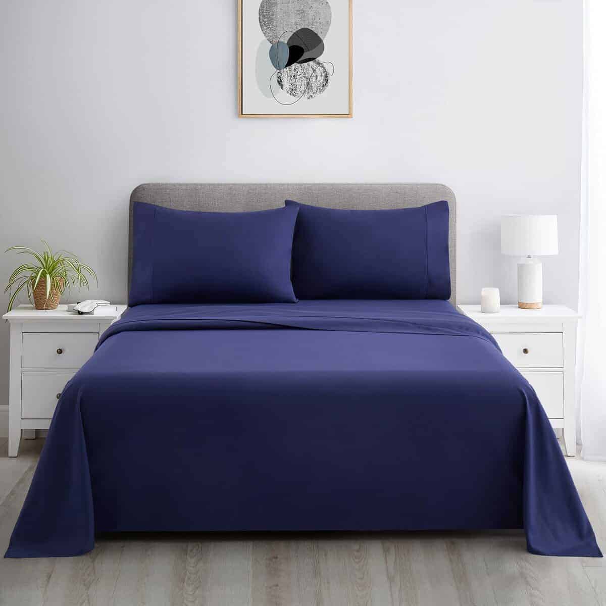 3. Material – 55% algodón y 45% poliéster. El juego de sábanas está hecho de algodón de fibra larga premium y poliéster de doble cepillado de tejido muy fino que es muy suave, resistente a las arrugas.