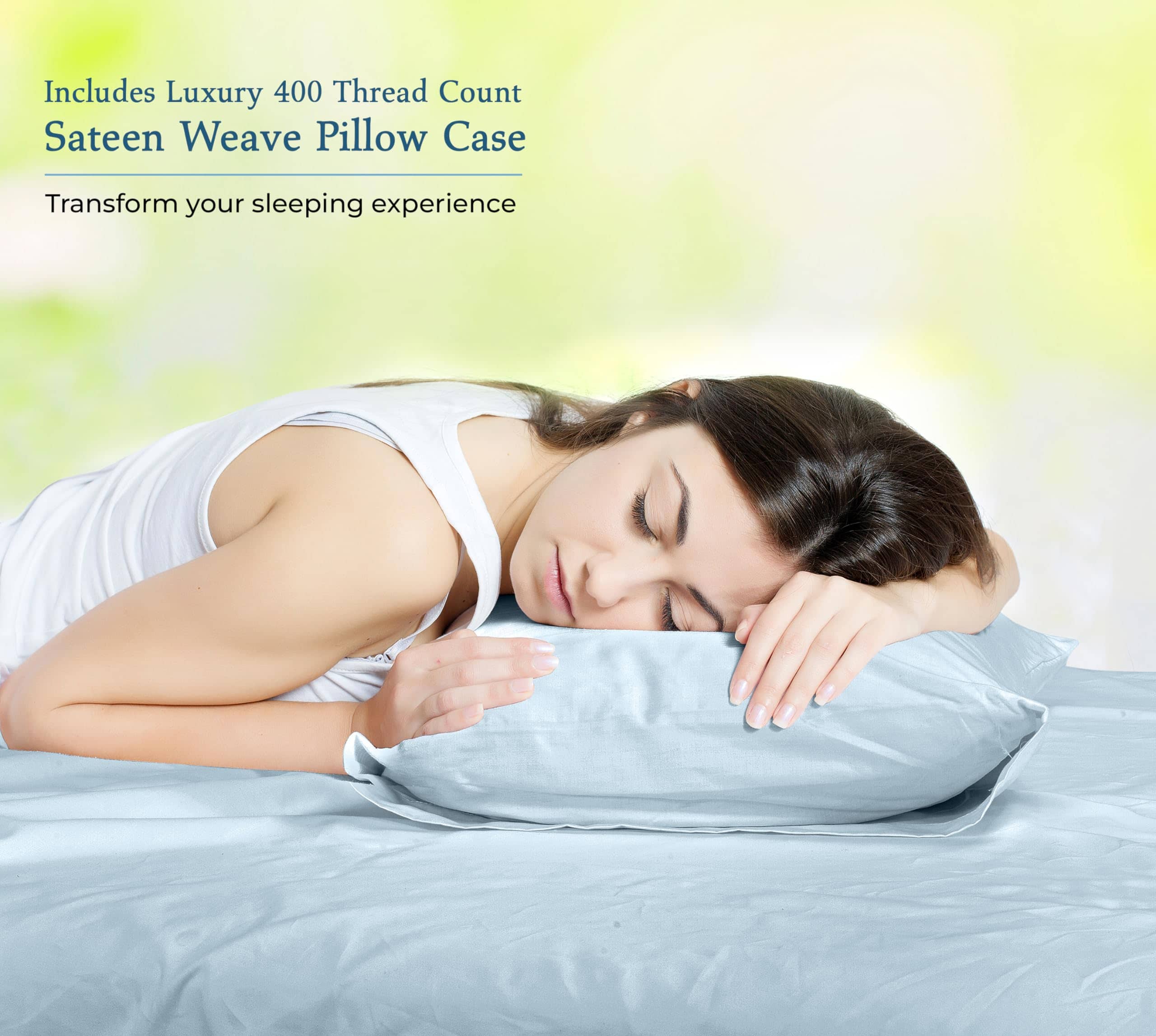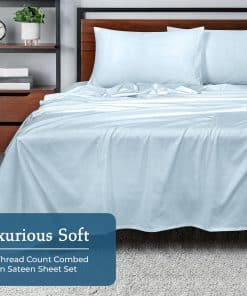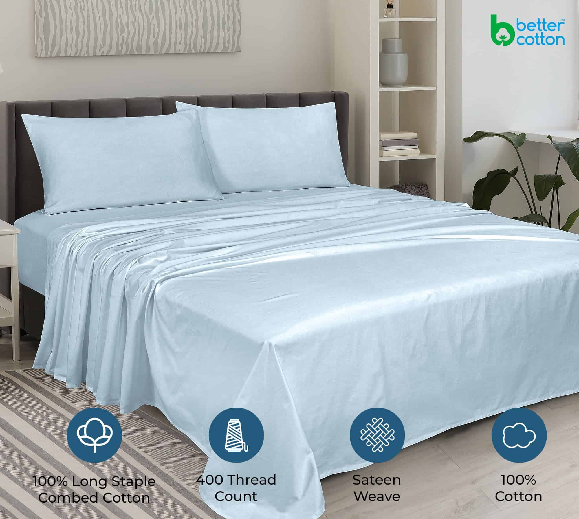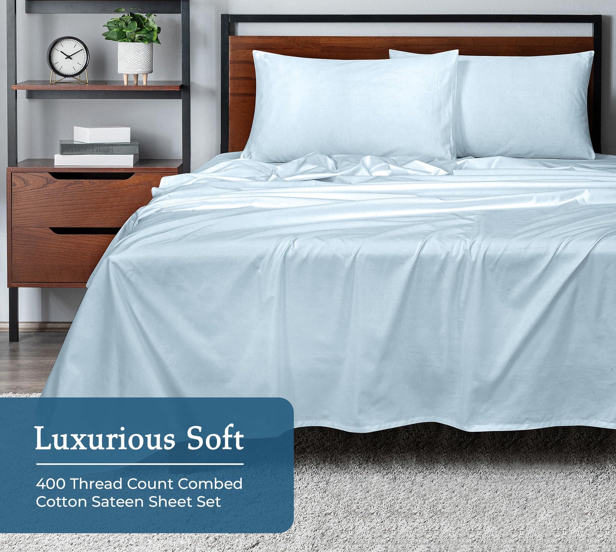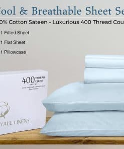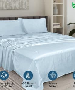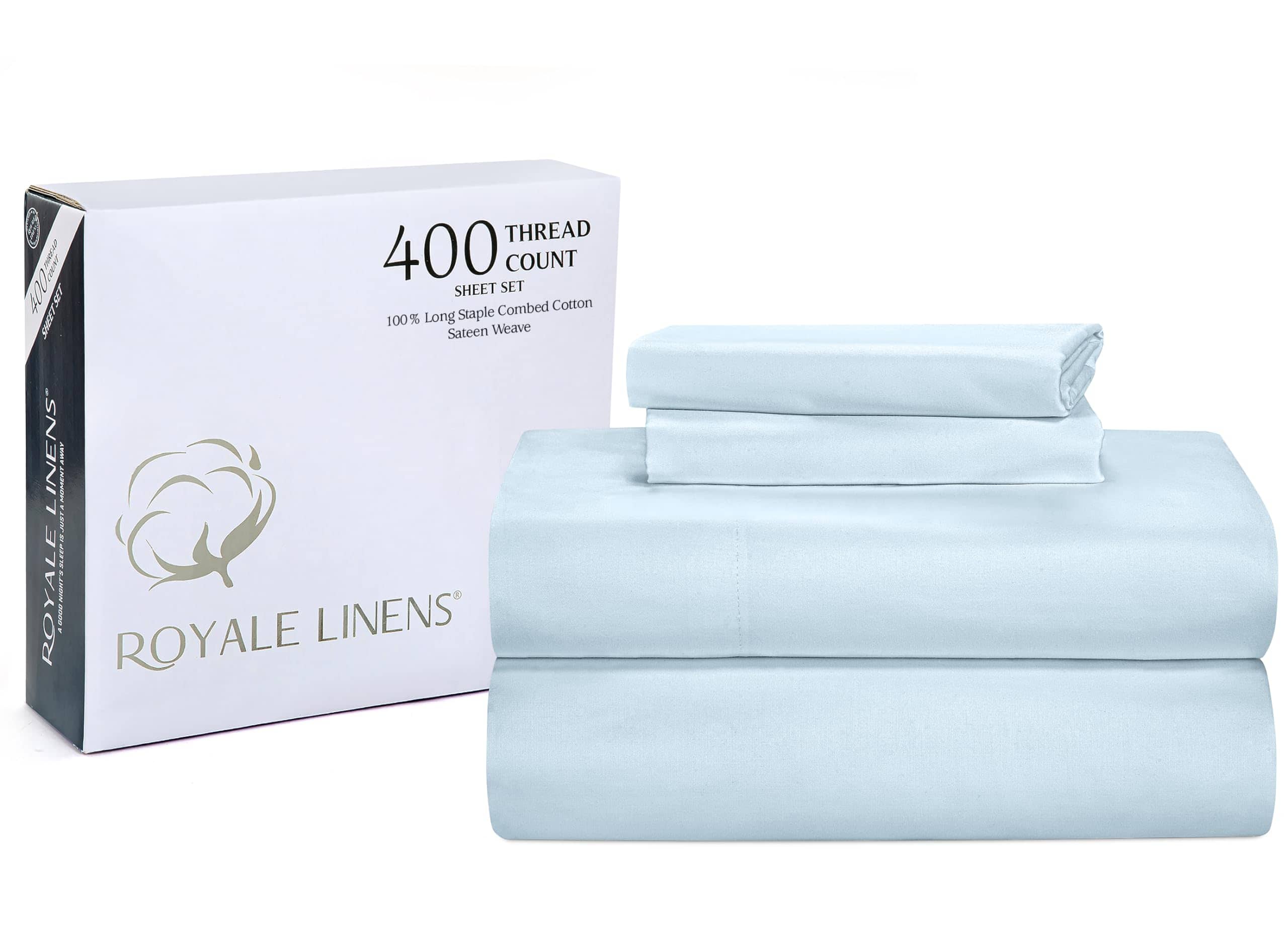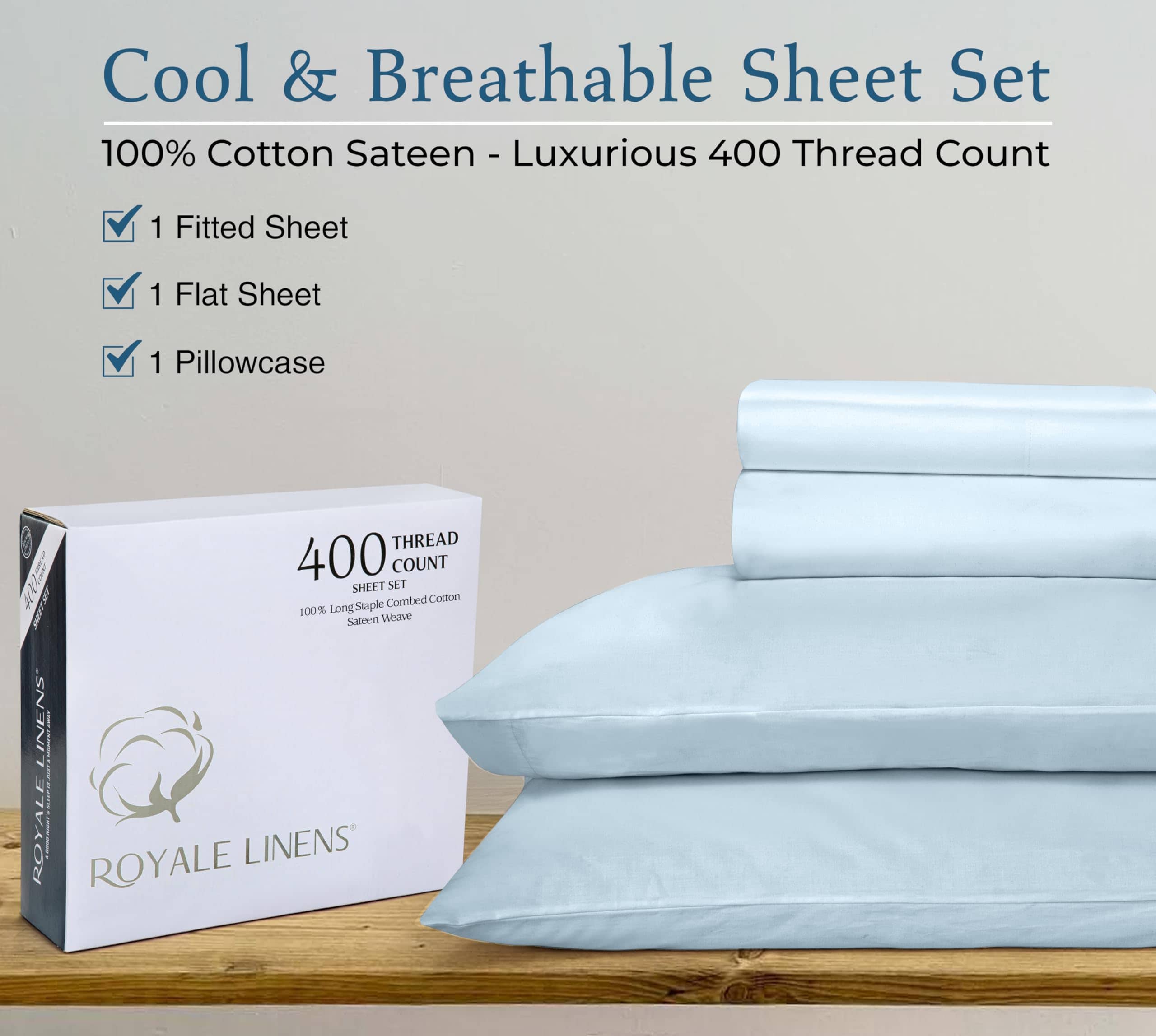 2. JUEGO DE SÁBANAS DE 400 HILOS DE ALGODÓN DE 4 PIEZAS: El juego de sábanas de satén con 400 hilos de Royale Linens 100% algodón incluye: 1 sábana plana de 90×102 pulgadas, 1 sábana ajustable de 60×80 pulgadas con caída de 16 pulgadas y 2 fundas de almohada de 20×30 pulgadas con dobladillo de 4 pulgadas y cierre tipo sobre.