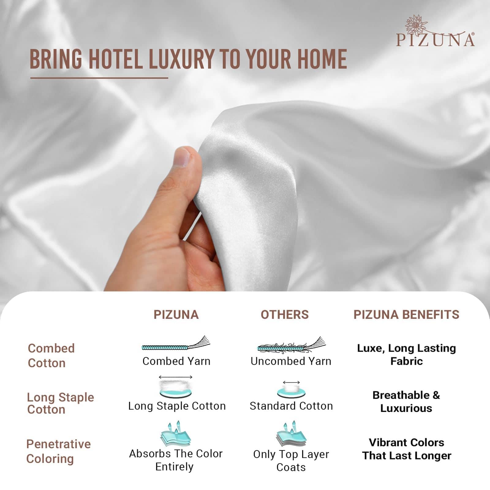 Conjunto de sábanas para cama queen incluye: 1 Sábana plana de tamaño Queen (90 x 102 ) – Absorbe rápidamente el sudor y protege de las manchas, asegurando la frescura del edredón o la colcha. 1 Sábana ajustable completamente elástica con bolsillo profundo (60 x 80 + 15 ) – Viene con un exclusivo cosido patentado que tiene un elástico grueso y de alta calidad para un ajuste firme en colchones de 20 a 38 cm de grosor. 2 Fundas de almohada queen (20 x 30 ) – Con un elegante dobladillo de 4″ estilo Pizuna que le da un aspecto elegante y un sueño confortable. La suavidad y la resistencia de este set de sábanas Queen size se logra mediante la técnica de hilado fino de Pizuna, que presenta una sarga de un solo diente (4 arriba-1 abajo). El uso del algodón peinado mercerizado 100% Puro y Natural hace que este set de sábanas de 400 hilos sea suave y resistente. La ropa de cama pura y natural de algodón arruga, pero es distintivamente más fresca y transpirable. Además, se ablanda y las arrugas se reducen con cada lavado. Los productos Pizuna son individualmente confeccionados, medidos y verificados (pieza por pieza) por nuestro equipo de Control de Calidad. La tela de estas sábanas queen size está certificada por OEKO-TEX y AZO-Free (2024), libre de sustancias sintéticas y respetuosa con el planeta, lo que la hace reconfortante incluso para las pieles más delicadas. Estas sábanas cumplen con el estándar de calidad de Pizuna y son respetuosas con el medio ambiente. La utilización de materiales reciclados para el embalaje puede añadir un olor desagradable que desaparece después del primer lavado en agua tibia. Hecho con tintes resistentes a la decoloración, es lavable a máquina en ciclo suave, secado en secadora a baja temperatura. El uso de lejía puede afectar los colores. Diseñado para un mejor sueño: Nuestros expertos en sueño internos estudian el comportamiento y los patrones de sueño del usuario, lo que resulta en una mejora del producto y un empaque compacto. Disponible globalmente en múltiples colores y tamaños, convierte este set de sábanas queen en la opción perfecta para regalar a tus seres queridos. Pizuna se preocupa: Miles de familias felices y medios de comunicación han elogiado nuestro lujoso set de sábanas de algodón. Sin embargo, si no estás satisfecho con el producto, puedes devolverlo dentro de los 30 días según la política, más allá de eso, nuestro equipo de atención al cliente estará allí para asistirte también.