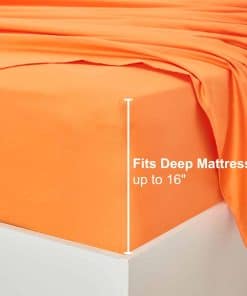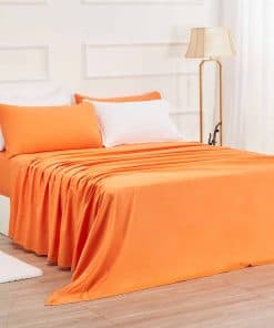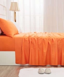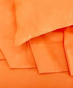 El juego de sábanas incluye una sábana plana de 94 por 100 pulgadas, una sábana ajustable de 54 por 75 por 16 pulgadas y dos fundas de almohada de 21 por 32 pulgadas. Todo en un vibrante color naranja que se coordina fácilmente con su entorno.