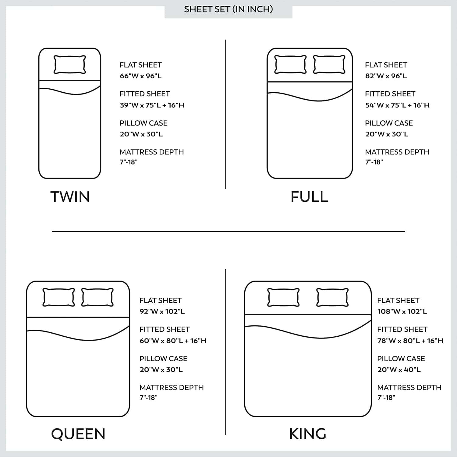 2. ¿Qué hay en el juego?: Nuestro juego de sábanas de cama king incluye 1 sábana plana (108 pulgadas de ancho x 102 pulgadas de largo), 1 sábana ajustable (78 pulgadas de ancho x 80 pulgadas de largo) y 2 fundas de almohada tamaño king (40 pulgadas de ancho x 20 pulgadas de largo) para adaptarse mejor a tus necesidades.