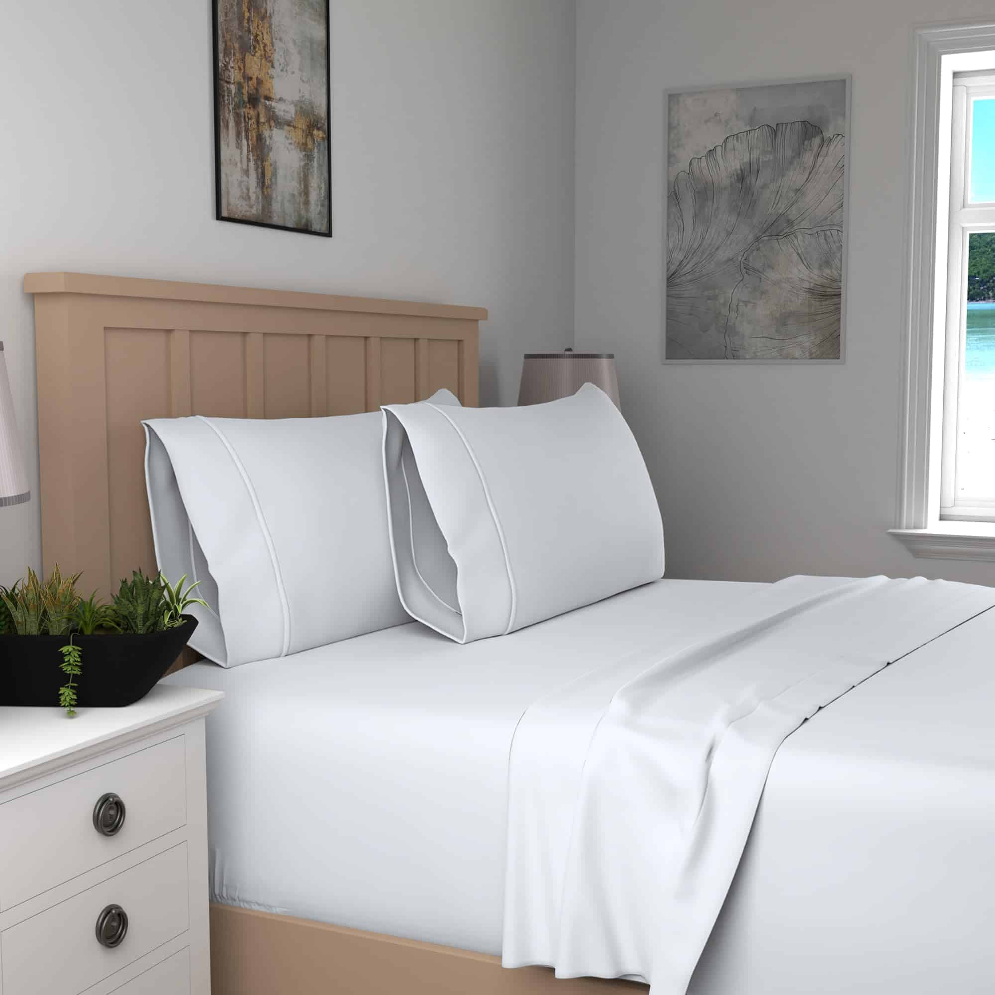 1. Siente el tejido: Nuestras sábanas de cama tamaño king cuentan con un clásico tejido de percal que es fresco, fresco y se siente suave contra la piel para que nunca pierdas un instante de sueño. Además, se suavizan después de cada lavado, haciéndolos más acogedores día a día.