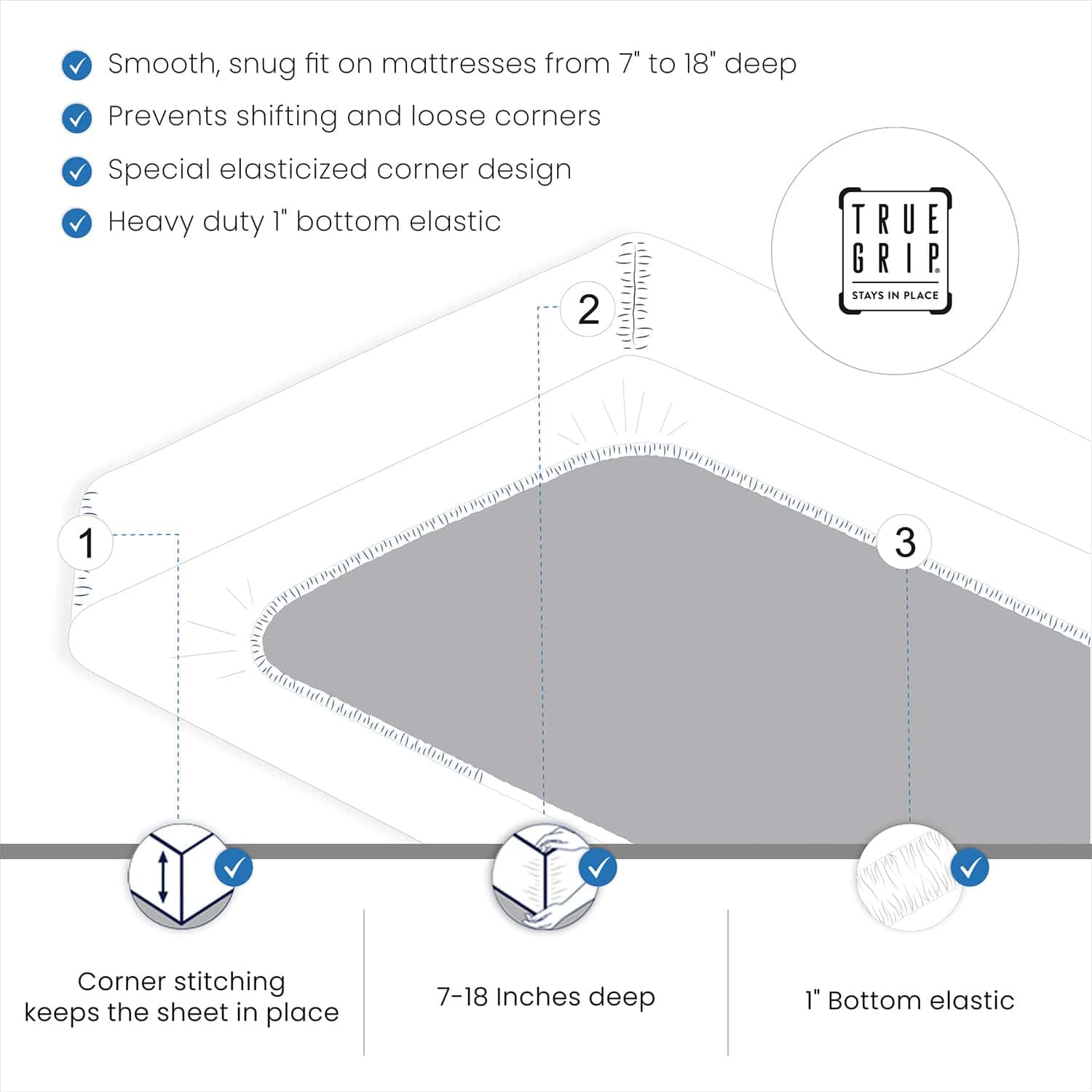3. Ajuste perfecto para tu colchón: Nuestra sábana ajustable cuenta con tecnología de ajuste True Grip patentada, que consta de una cinta elástica de 1 pulgada de ancho en los bordes junto con un elástico de -pulgada en el dobladillo, proporcionando un ensamblaje de ajuste ceñido con distintas profundidades de colchones. También cuenta con una «Etiqueta inteligente para cabeza/pie» para una fácil identificación de los lados.