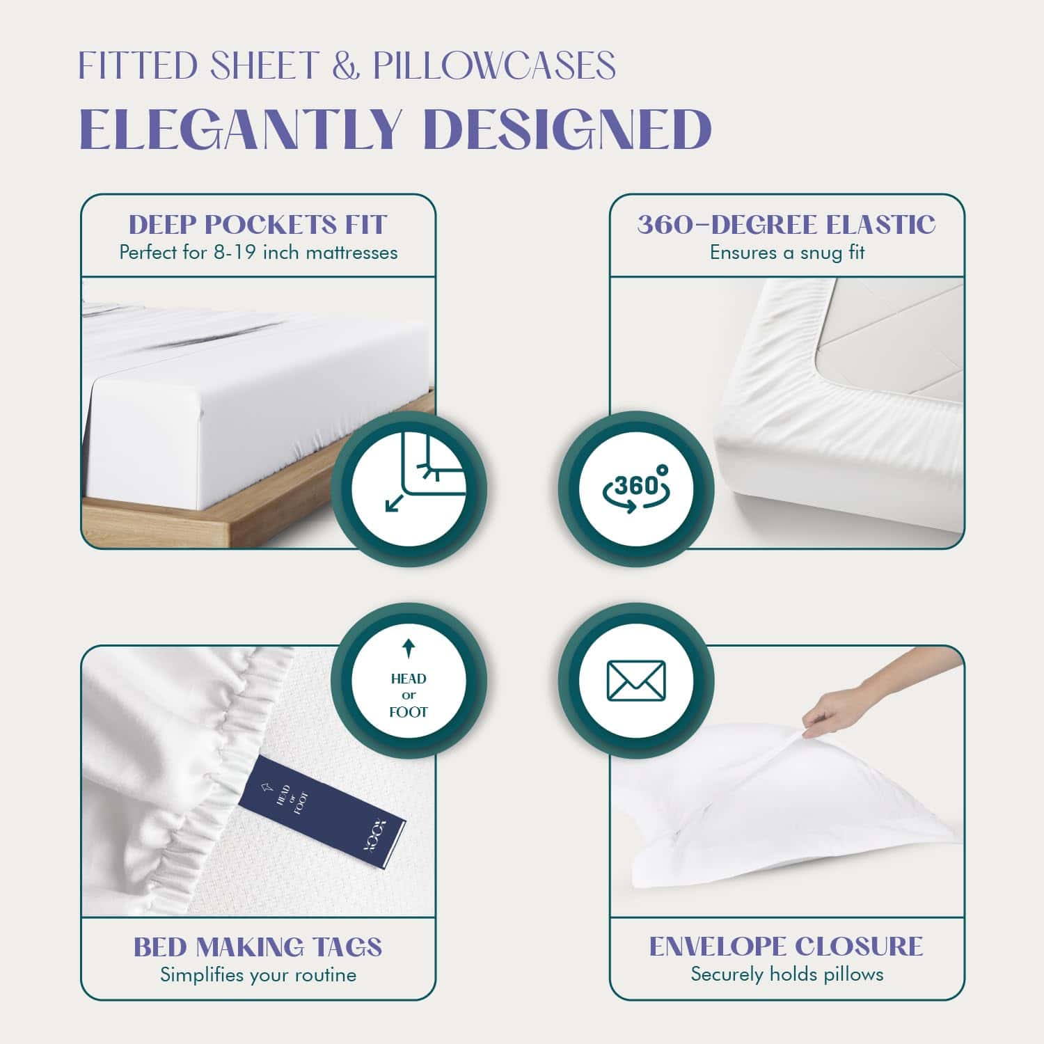 4. Juego de sábanas completo y ajustado de 4 piezas: Nuestro juego de sábanas Cal King incluye 4 piezas para una solución de ropa de cama completa: 1 sábana plana (108″ x 102″), 1 sábana ajustable (72″ x 84″ + 19″), y 2 fundas de almohada tamaño king (21″ x 41″). La sábana ajustable elasticizada cuenta con un bolsillo extra profundo de 17 pulgadas para adaptarse a colchones de hasta 19 pulgadas. Las fundas de almohada cuentan con un cierre abierto para una fácil inserción de almohadas.