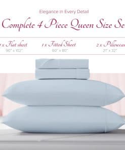 4. Incluye un Juego de Sábanas de 4 Piezas Completo y Bien Ajustado: El Juego de Sábanas de Algodón Egipcio Queen incluye 4 piezas: 1 sábana plana (90″ x 102″), 1 sábana ajustable (60″ x 80″ + 17″), y 2 fundas de almohada tamaño Estándar / Queen (21″ x 32″). La sábana ajustada elasticizada viene con un bolsillo extra profundo de 17 pulgadas para acomodar fácilmente colchones regulares y altos de hasta 19 pulgadas. Las fundas de almohada tienen un cierre abierto para que las almohadas grandes puedan deslizarse fácilmente.