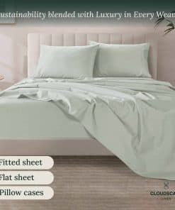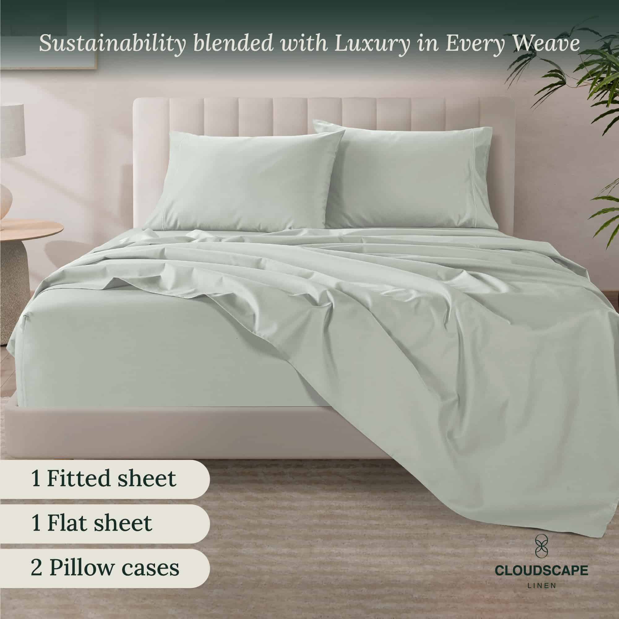 5. LUJO SOSTENIBLE, ASEQUIBLE Y CERTIFICADO: En Cloud Scape Linen, estamos comprometidos con prácticas sostenibles y éticamente elaboradas con un mínimo uso de productos químicos en la fabricación. Nuestros juegos de sábanas y fundas de almohada de algodón tamaño king en color verde claro tienen orgulloso la certificación OEKO-TEX y vienen empaquetados en una bolsa de tela reutilizable, reduciendo el desperdicio innecesario y promoviendo prácticas sostenibles.