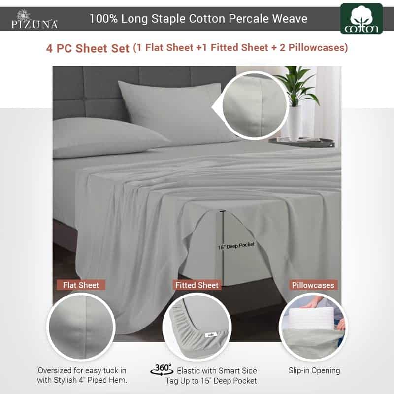 2. Costura patentada para un ajuste perfecto: Este juego de sábanas incluye: 1 sábana plana/top de tamaño King (108 x 102) – Absorbe rápidamente el sudor y protege contra manchas, asegurando la frescura del edredón o la manta. 1 sábana ajustable completamente elasticada con bolsillos profundos (78 x 80 + 15) – Viene con una costura patentada única que tiene elástico grueso y de alta calidad para un ajuste firme en colchones de 8 a 15 pulgadas de grosor. 2 fundas de almohada de tamaño King (20 x 40) – Con un elegante borde de 4 pulgadas de diseño Pizuna que brinda un aspecto elegante y un sueño confortable.