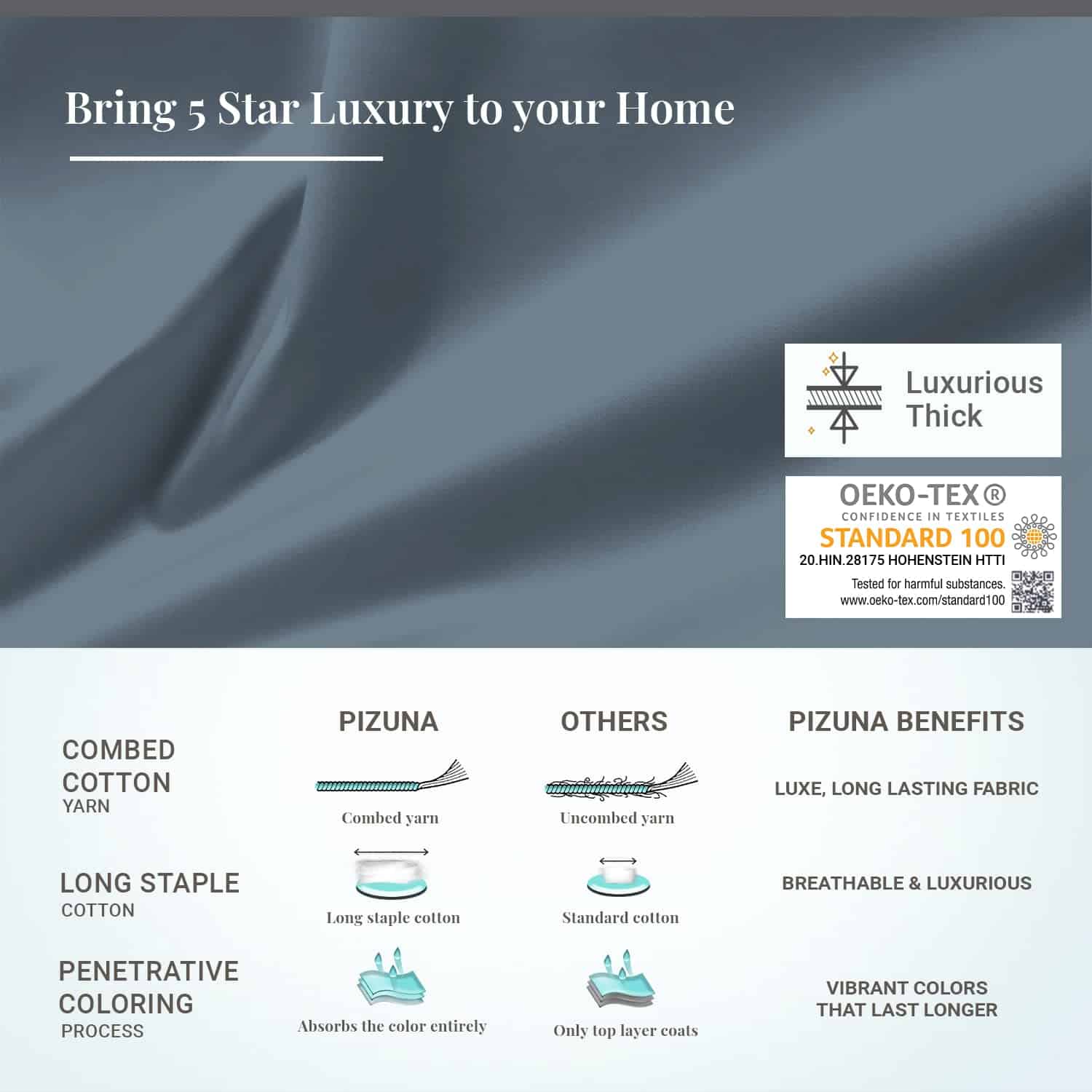 1. Amigable con la piel, fresco y suave: Elaborado con 100% algodón peinado de fibra larga tejido de satén, este espléndido juego de sábanas de tamaño completo de 600 hilos está hecho con hilos especialmente compactados con su textura de peso medio. La mínima manipulación artificial hace que este juego de sábanas de tamaño completo sea suave en todo tipo de piel, previene los sudores nocturnos, absorbe la humedad y regula la temperatura corporal para dormir fresco manteniendo la apariencia de hotel premium. 2. Costura patentada para un ajuste perfecto: 1 Juego de sábanas full incluye: Sábana plana/top de tamaño completo (81 x 100) – Absorbe rápidamente el sudor y protege de manchas, garantizando la frescura del edredón. 1 Sábana ajustable completamente elástica con bolsillos profundos (54 x 75 + 15 ) – Viene con una costura patentada única que cuenta con elástico grueso y de alta calidad para un ajuste firme en colchones de 8 a 15 de grosor. 2 Fundas de almohada estándar (20 x 30) – Con el dobladillo con ribete de 4 pulgadas con estilo Pizuna que da un aspecto elegante y un sueño confortable. 3. 100% algodón mercerizado puro y natural: Con la técnica de hilado fino de Pizuna, este juego de sábanas de algodón de 600 hilos cuenta con un tejido de satén de doble trama (4 arriba-1 abajo). El uso de algodón peinado mercerizado hace que este juego de sábanas sea fuerte y suave. La ropa de cama de algodón puro y natural se arruga, pero es distintivamente más fresca y transpirable. Además, se suaviza y la arruga se reduce con cada lavado. 4. Estándar de Calidad Pizuna: Los productos de Pizuna son individualmente confeccionados, medidos y revisados (pieza por pieza) por nuestro equipo de Control de Calidad. La tela del juego de sábanas de tamaño completo está certificada por OEKO-TEX, libre de productos químicos, ecológica y certificada sin AZO, lo que la hace suave para la piel más delicada. 5. Indulge de manera responsable: Este juego de sábanas es compatible con BSCI, socialmente responsable y respetuoso con el medio ambiente. El uso de materiales reciclados para el embalaje puede agregar un olor desagradable que desaparece después del primer lavado en agua tibia. Hecho con tintes resistentes a la decoloración, es apto para lavar a máquina en un ciclo suave, secar a baja temperatura. El uso de lejía puede afectar los colores. 6. Diseñado para un mejor sueño: Nuestros expertos en sueño internos estudian el comportamiento y los patrones de sueño del usuario, lo que resulta en la mejora del producto y en un empaque compacto. Disponible globalmente en múltiples colores y tamaños, convierte este juego de sábanas de tamaño completo en la opción de regalo perfecta para sus seres queridos. 7. Pizuna se preocupa: Miles de familias felices y medios de comunicación han elogiado nuestro lujoso juego de sábanas de algodón. Sin embargo, si no está satisfecho con el producto, puede devolverlo dentro de los 30 días según la política, más allá de eso nuestro equipo de atención al cliente estará allí para ayudarlo también.