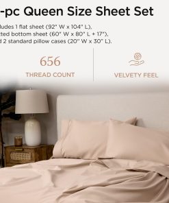 Threadmill Juego de sábanas de algodón Supima Queen | 656 hilos para colchón Queen | 4 Piezas de sábanas de lujo | Tela satinada de alta calidad | Sábanas color beige