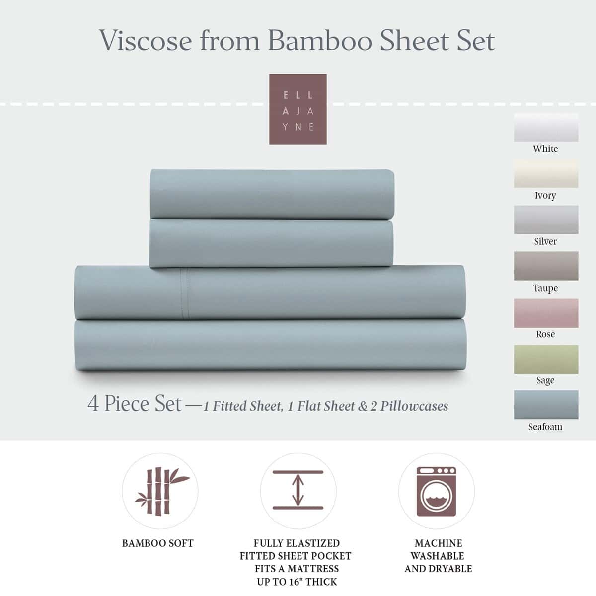 4. AJUSTE PERFECTO PARA CUALQUIER TAMAÑO DE CAMA: Ya sea que estés vistiendo una cama King, Queen o de tamaño completo, nuestro set versátil incluye 1 Sábana Ajustable, 1 Sábana Plana y 2 Fundas de Almohada. Cada set de sábanas de bambú viscosa tamaño King, set de sábanas de bambú viscosa Queen o sábanas de bambú viscosa de tamaño completo está diseñado cuidadosamente con bolsillos profundos de 16″ para adaptarse a cualquier colchón, asegurando un ajuste ceñido todas las noches con nuestra característica de bolsillo profundo. Disponible en blanco, marfil, taupe, plateado, seafoam, salvia y rosa.