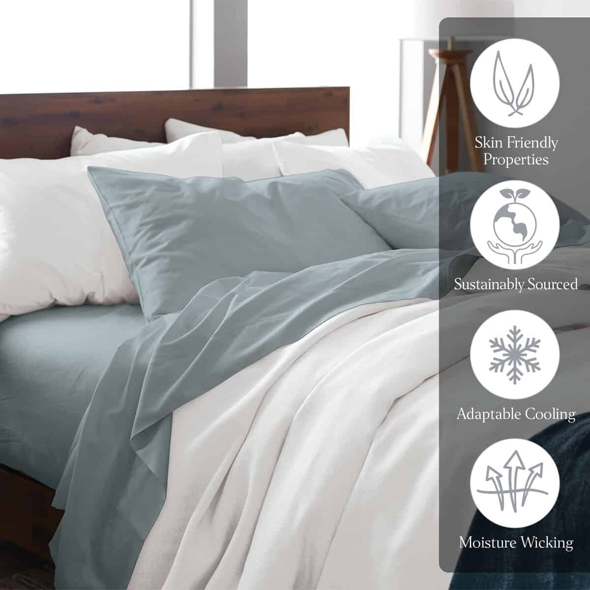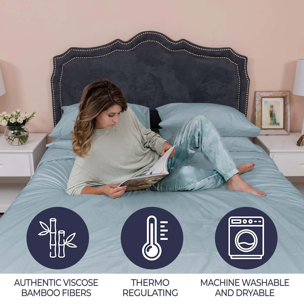 3. ABSORCIÓN DE HUMEDAD: Disfruta de una noche de sueño fresca y seca con nuestras sábanas de bambú viscosa que absorben la humedad. Diseñadas para una transpirabilidad natural, son ideales para aquellos que duermen en climas cálidos, asegurándote de que te mantengas cómodo toda la noche.