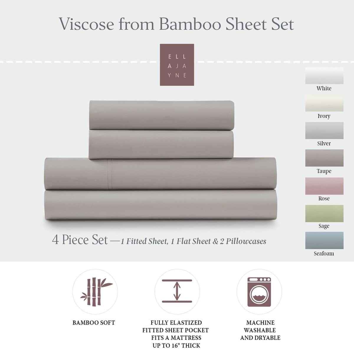 1. EXPERIENCIA DE CONFORT: Fabricado con 100% de bambú viscosa obtenido de forma sostenible, nuestro juego de sábanas de bambú viscosa Ella Jayne ofrece una suavidad sedosa como ninguna otra. Hecho exclusivamente con fibras de bambú viscosa natural de alta calidad, nuestras sábanas ofrecen una experiencia de sueño de lujo. Combinan la transpirabilidad y los beneficios refrescantes con la suavidad incomparable del bambú viscosa, perfecto para aquellos que buscan una opción de ropa de cama ecológica pero lujosa. 2. ECOLÓGICO: Nuestras sábanas de bambú viscosa apoyan un entorno de sueño limpio. Las propiedades naturales de las fibras de bambú viscosa ofrecen una superficie de descanso suave y cómoda, fomentando un entorno de sueño más saludable! 3. ABSORCIÓN DE HUMEDAD: Disfruta de una noche de sueño fresca y seca con nuestras sábanas de bambú viscosa que absorben la humedad. Diseñadas para la transpirabilidad natural, son ideales para los que duermen calientes o en climas cálidos, asegurando que te mantengas cómodo toda la noche. 4. AJUSTE PERFECTO PARA CUALQUIER TAMAÑO DE CAMA: Ya sea que estés vistiendo una cama king, queen o full, nuestro juego versátil incluye 1 sábana ajustable, 1 sábana plana y 2 fundas de almohada. Cada juego de sábanas de bambú viscosa tamaño king, juego de sábanas de bambú viscosa queen, o sábanas de bambú viscosa tamaño completo está pensado con bolsillos profundos de 16″ para adaptarse a cualquier colchón, asegurando un ajuste ceñido cada noche con nuestra característica de bolsillo profundo. Disponible en blanco, marfil, taupe, plata, espuma marina, salvia y rosa. 5. GARANTÍA DE SATISFACCIÓN GARANTIZADA Y SOPORTE EXCEPCIONAL: En Ella Jayne, nos enorgullecemos de ser una empresa con sede en EE. UU. que respalda nuestros productos con un compromiso con tu absoluta satisfaccióñana perfecta.