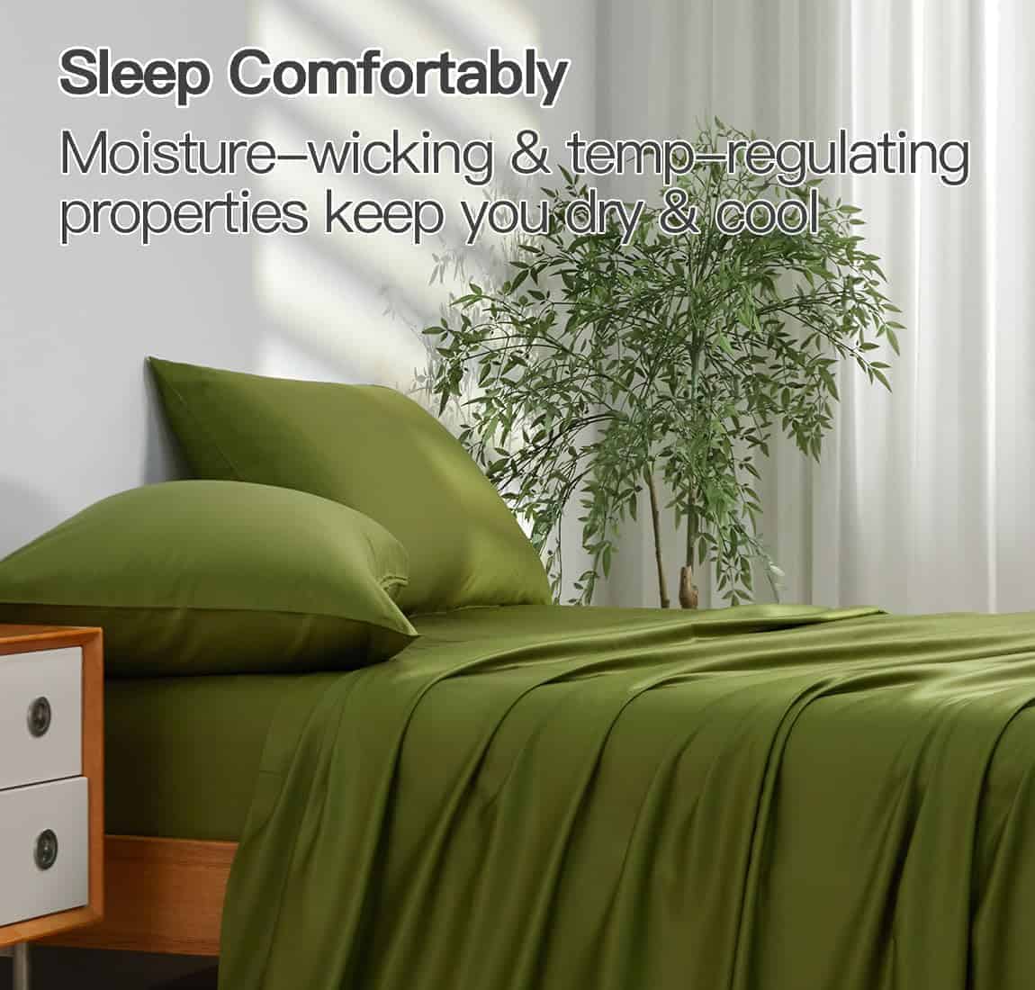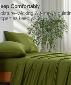 Las sábanas de Delynvan en verde son increíblemente suaves y confortables, hechas de 100% Rayon derivado del bambú, sin ingredientes adicionales. Su tejido satinado y de 400 hilos proporciona una sensación lujosa, similar a la ropa de cama de hoteles de 6 estrellas. Son transpirables, absorbentes y termorreguladoras, manteniéndote fresco todo el año. El diseño de bolsillo extra profundo se adapta a colchones de 18″ – 24″ pulgadas, con elástico duradero alrededor de la sábana ajustable. Lavables a máquina para un cuidado fácil, estas sábanas se vuelven más suaves con cada lavado. El juego incluye: 1 sábana ajustable King Size ( 78.35′ x 80.32′ x 20.08′) , 1 sábana plana de Bambú ( 108.28′ x 102.36′ ), 2 fundas de almohada ( 20.08′ x 40.16� )