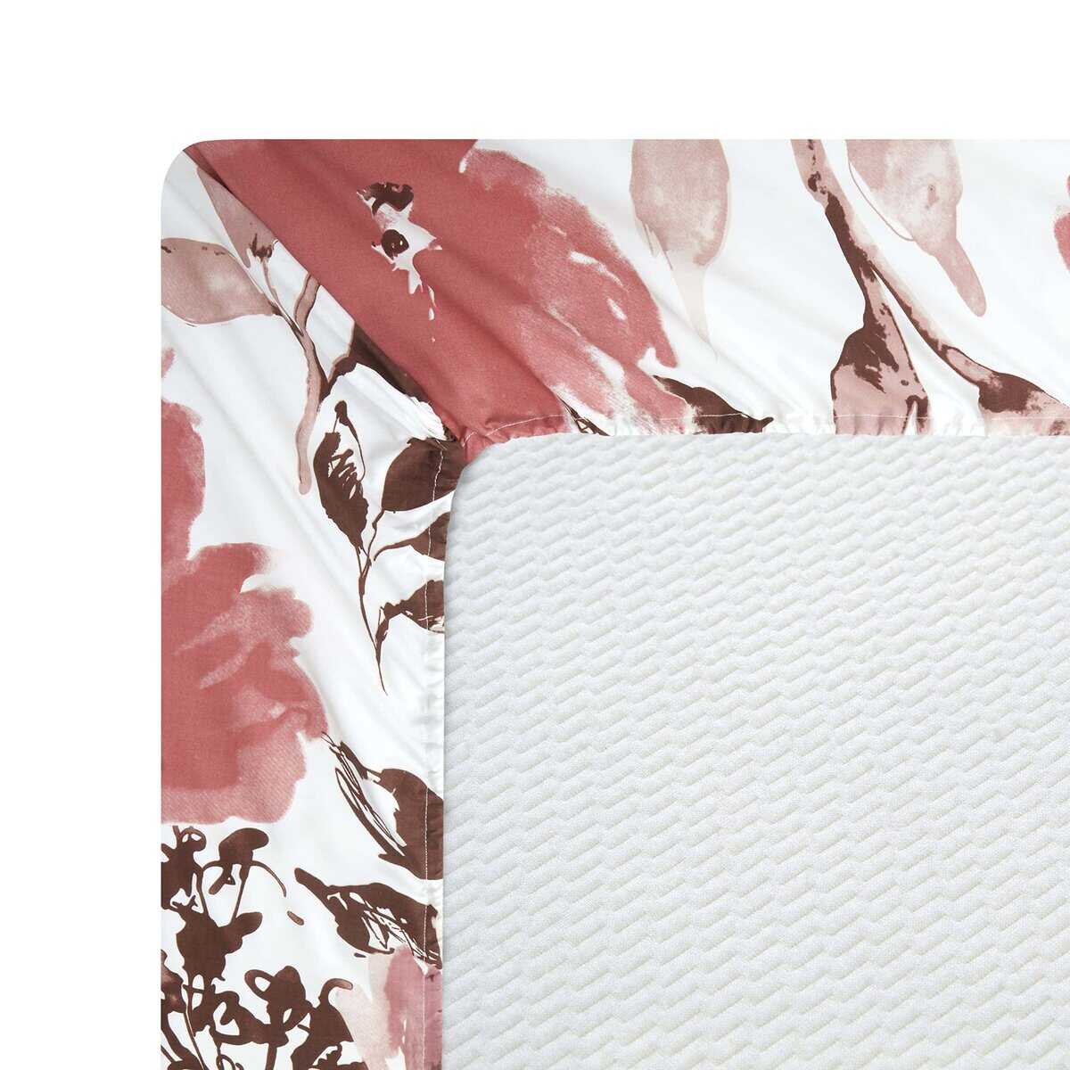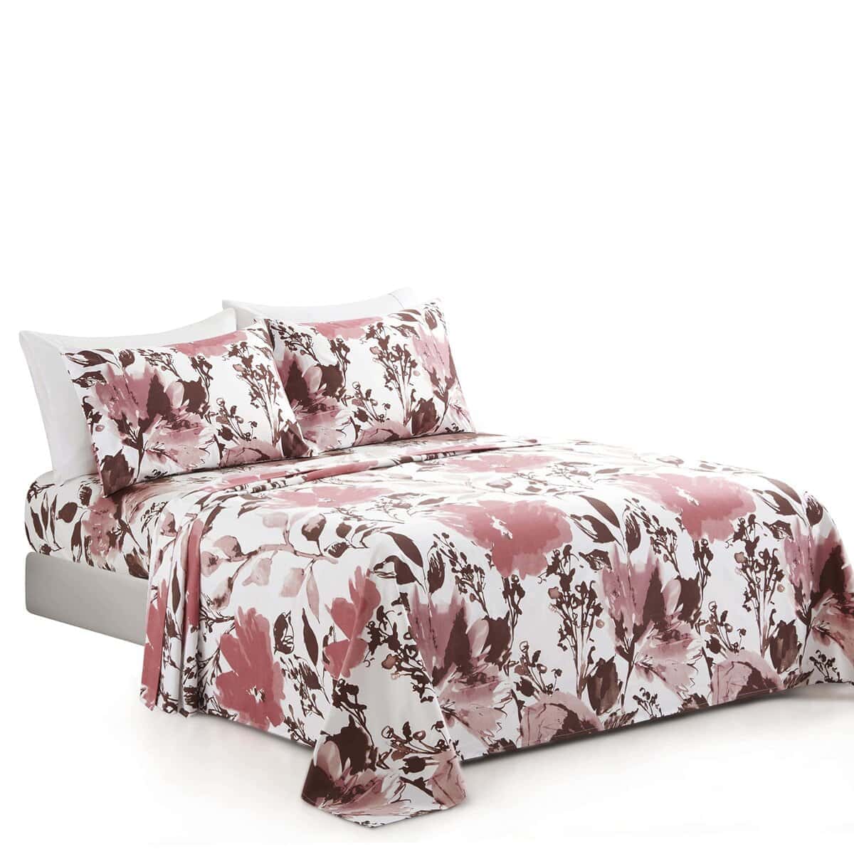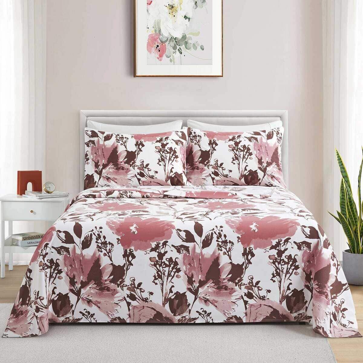 Diseño moderno con patrones de flores en tonos blancos con flores rojas y rosas, ramas marrones y hojas decoradas. Incluye 2 fundas de almohada a juego. Hecho de poliéster de doble cepillado de 120 GSM y bambú, suave, duradero y transpirable. Tamaño completo que incluye 1 sábana plana de 81 x 96 pulgadas, 1 sábana ajustable de 54 x 75 + 15 pulgadas, 2 fundas de almohada estampadas de 20 x 30 pulgadas y 2 fundas de almohada lisas de 20 x 30 pulgadas.