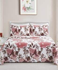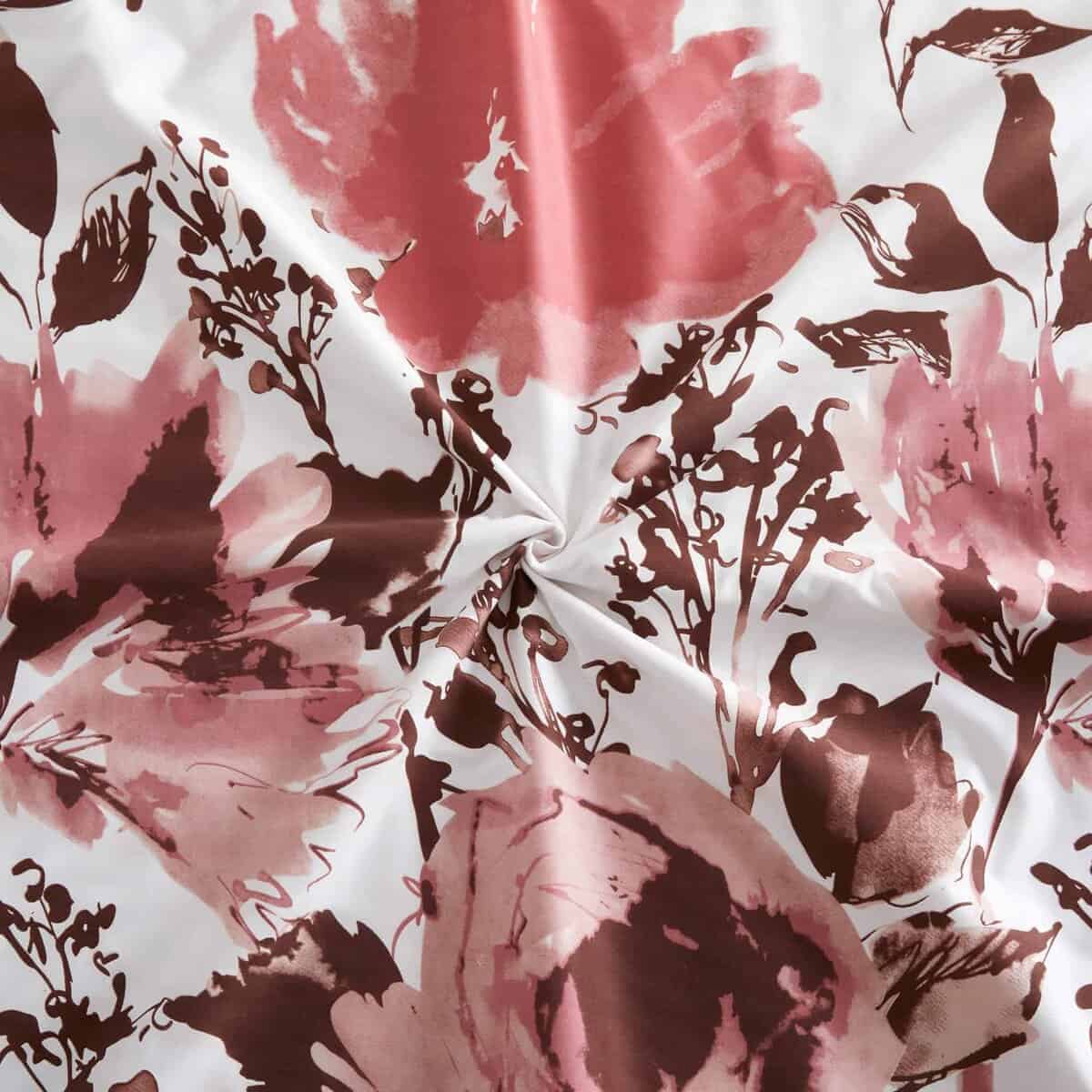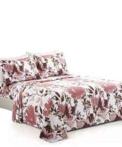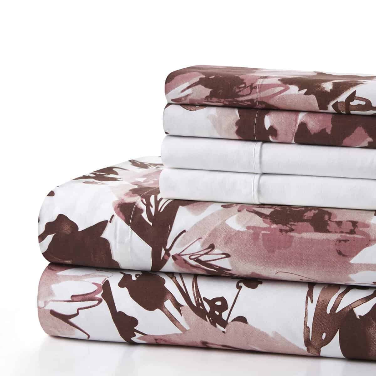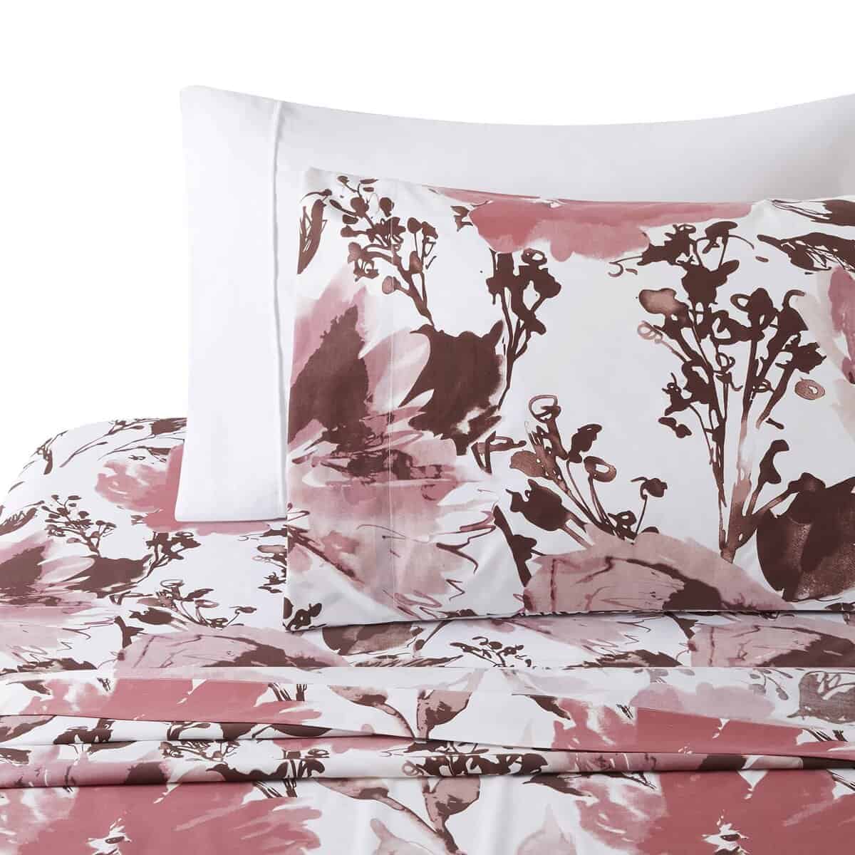 Diseño moderno con patrones de flores en tonos blancos con flores rojas y rosas, ramas marrones y hojas decoradas. Incluye 2 fundas de almohada a juego. Hecho de poliéster de doble cepillado de 120 GSM y bambú, suave, duradero y transpirable. Tamaño completo que incluye 1 sábana plana de 81 x 96 pulgadas, 1 sábana ajustable de 54 x 75 + 15 pulgadas, 2 fundas de almohada estampadas de 20 x 30 pulgadas y 2 fundas de almohada lisas de 20 x 30 pulgadas.